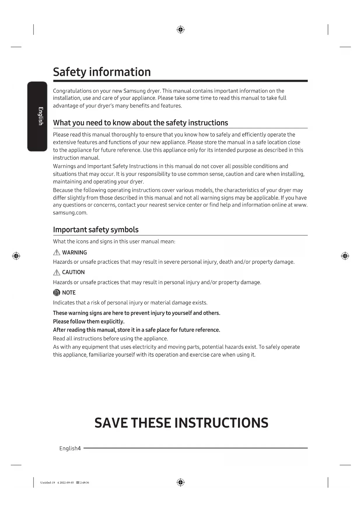 English4 Safety information Congratulations on your new Samsung dryer. This manual contains important information on the installation, use and care of your appliance. Please take some time to read this manual to take full advantage of your dryer’s many benefits and features. What you need to know about the safety instructions Please read this manual thoroughly to ensure that you know how to safely and efficiently operate the extensive features and functions of your new appliance. Please store the manual in a safe location close to the appliance for future reference. Use this appliance only for its intended purpose as described in this instruction manual. Warnings and Important Safety Instructions in this manual do not cover all possible conditions and situations that may occur. It is your responsibility to use common sense, caution and care when installing, maintaining and operating your dryer. Because the following operating instructions cover various models, the characteristics of your dryer may differ slightly from those described in this manual and not all warning signs may be applicable. If you have any questions or concerns, contact your nearest service center or find help and information online at www. samsung.com. Important safety symbols What the icons and signs in this user manual mean: WARNING Hazards or unsafe practices that may result in severe personal injury, death and/or property damage. CAUTION Hazards or unsafe practices that may result in personal injury and/or property damage. NOTE Indicates that a risk of personal injury or material damage exists. These warning signs are here to prevent injury to yourself and others. Please follow them explicitly. After reading this manual, store it in a safe place for future reference. Read all instructions before using the appliance. As with any equipment that uses electricity and moving parts, potential hazards exist. To safely operate this appliance, familiarize yourself with its operation and exercise care when using it. Untitled-19 4 2022-09-05 2:49:36English