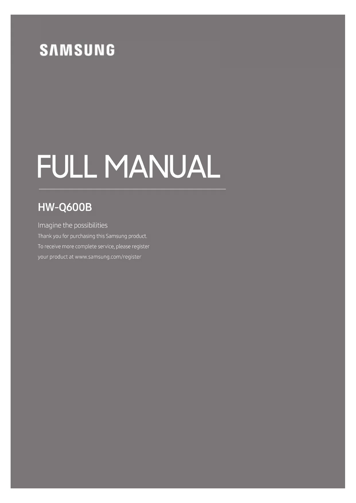 HW-Q600B FULL MANUAL Imagine the possibilities Thank you for purchasing this Samsung product. To receive more complete service, please register your product at www.samsung.com/registerENG - 2 SAFETY INFORMATION SAFETY WARNINGS TO REDUCE THE RISK OF ELECTRIC SHOCK, DO NOT REMOVE THE COVER (OR BACK). NO USER-SERVICEABLE PARTS ARE INSIDE.