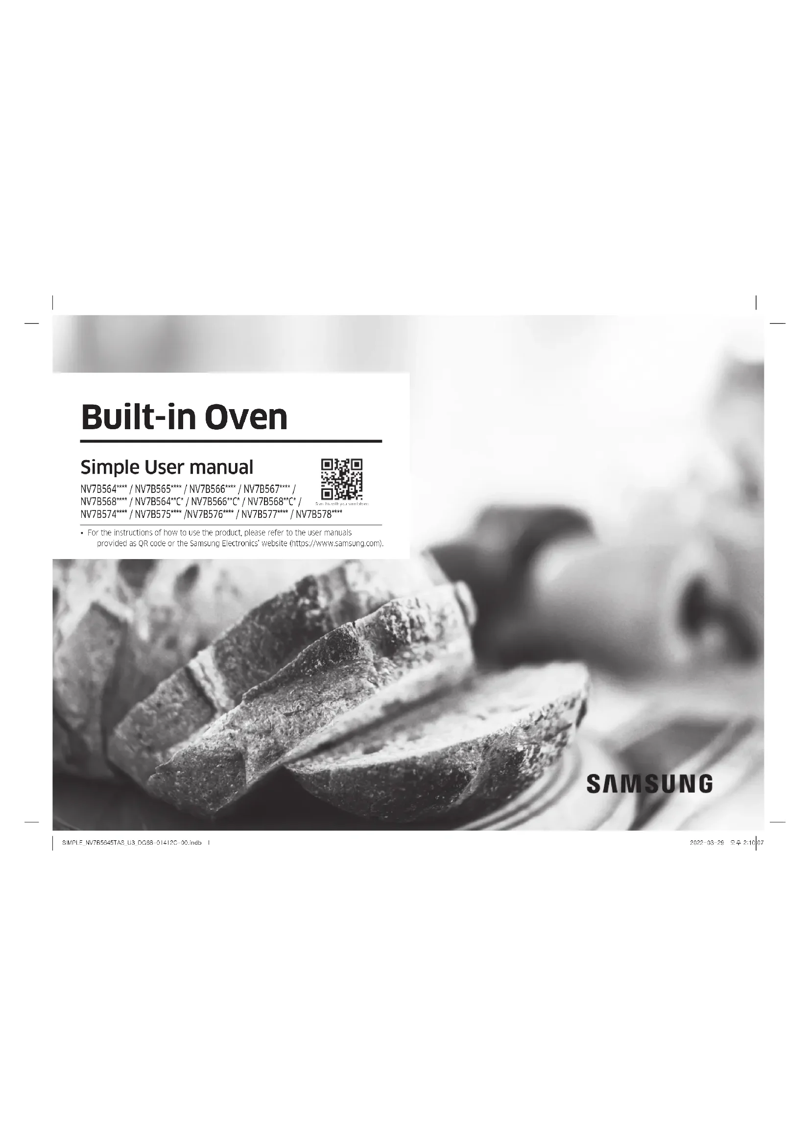 - For the instructions of how to use the product, please refer to the user manuals provided as QR code or the Samsung Electronics’ website (https://www.samsung.com). Scan this with your smartphone. SIMPLE_NV7B5645TAS_U3_DG68-01412C-00.indb 1SIMPLE_NV7B5645TAS_U3_DG68-01412C-00.indb 1 2022-03-29 오후 2:10:072022-03-29 오후 2:10:072 English Contents Contents Contents Safety instructions 3 Important safety precautions 3 Correct Disposal of This Product (Waste Electrical & Electronic Equipment) 6 Auto energy saving function 6 Installation 6 Prepare to install the oven 6 Power connection 6 Cabinet mount 7 Maintenance 9 Cleaning 9 Replacement 12 Oven features 12 Oven 12 Control panel 13 Accessories 13 Oven use 13 Flexible Door 13 Wi-Fi / My Patterns 13 Air Fry 14 Air Sous Vide 14 Cooking with the meat probe 15 Natural Steam 15 Using the auto cook features 16 Troubleshooting and information code 16 Troubleshooting 16 Information codes 17 Technical specications 18