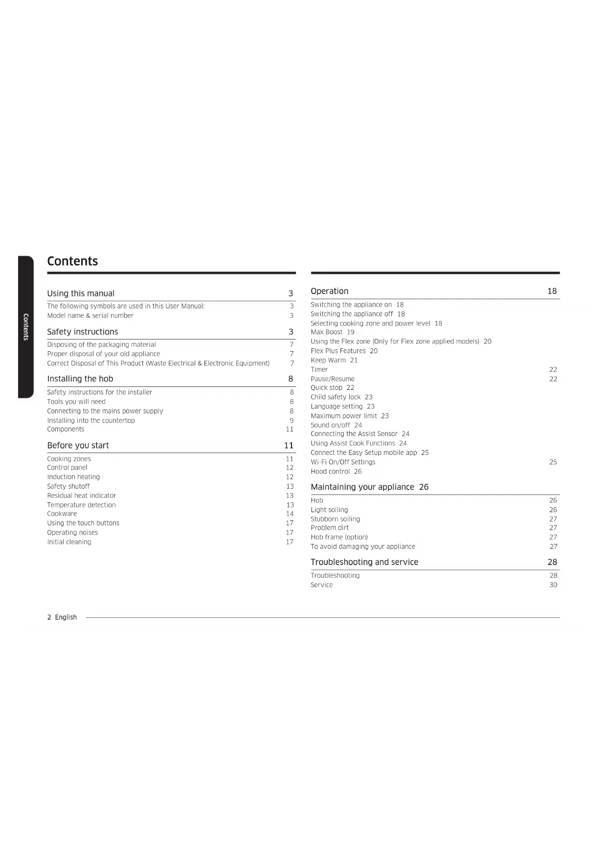 Induction Hob User manual NZ64B7799**2 English Contents Contents Operation 18 Switching the appliance on 18 Switching the appliance off 18 Selecting cooking zone and power level 18 Max Boost 19 Using the Flex zone (Only for Flex zone applied models) 20 Flex Plus Features 20 Keep Warm 21 Timer 22 Pause/Resume 22 Quick stop 22 Child safety lock 23 Language setting 23 Maximum power limit 23 Sound on/off 24 Connecting the Assist Sensor 24 Using Assist Cook Functions 24 Connect the Easy Setup mobile app 25 Wi-Fi On/Off Settings 25 Hood control 26 Maintaining your appliance 26 Hob 26 Light soiling 26 Stubborn soiling 27 Problem dirt 27 Hob frame (option) 27 To avoid damaging your appliance 27 Troubleshooting and service 28 Troubleshooting 28 Service 30 Contents Using this manual 3 The following symbols are used in this User Manual: 3 Model name & serial number 3 Safety instructions 3 Disposing of the packaging material 7 Proper disposal of your old appliance 7 Correct Disposal of This Product (Waste Electrical & Electronic Equipment) 7 Installing the hob 8 Safety instructions for the installer 8 Tools you will need 8 Connecting to the mains power supply 8 Installing into the countertop 9 Components 11 Before you start 11 Cooking zones 11 Control panel 12 Induction heating 12 Safety shutoff 13 Residual heat indicator 13 Temperature detection 13 Cookware 14 Using the touch buttons 17 Operating noises 17 Initial cleaning 17English 3 Using this manual Using this manual Please take the time to read this owner’s manual, paying particular attention to the safety information contained in the following section, before using your appliance. Keep this manual for future reference. If transferring ownership of the appliance, please remember to pass the manual on to the new owner. The following symbols are used in this User Manual: WARNING Hazards or unsafe practices that may result in severe personal injury or death. CAUTION Hazards or unsafe practices that may result in minor personal injury or property damage. CAUTION To reduce the risk of re, explosion, electric shock, or personal injury when using your hob, follow these basic safety precaution. NOTE Useful tips, recommendations, or information that helps users manipulate the product. Model name & serial number Both the model name and the serial number are labeled underneath the hob base. For later use, write down the information or attach the additional product label (located on the top of the product) onto the current page. Model Name Serial Number Safety instructions The safety aspects of this appliance comply with all accepted technical and safety standards. However, as manufacturers we also believe it is our responsibility to familiarize you with the following safety instructions. WARNING This appliance is not intended for use by persons (including children) with reduced physical, sensory or mental capabilities, or lack of experience and knowledge, unless they have been given supervision or instruction concerning use of the appliance by a person responsible for their safety. Children should be supervised to ensure that they do not play with the appliance. This appliance can be used by children aged from 8 years and above and persons with reduced physical, sensory or mental capabilities or lack of experience and knowledge if they have been given supervision or instruction concerning use of the appliance in a safe way and understand the hazards involved. Children shall not play with the appliance. Cleaning and user maintenance shall not be made by children without supervision. The means for disconnection must be incorporated in the xed wiring in accordance with the wiring rules.4 English Safety instructions Safety instructions The appliance is not intended to be operated by means of an external timer or separate remote-control system. CAUTION: The cooking process has to be supervised. A short term cooking process has to be supervised continuously. The appliance must not be installed behind a decorative door in order to avoid overheating.