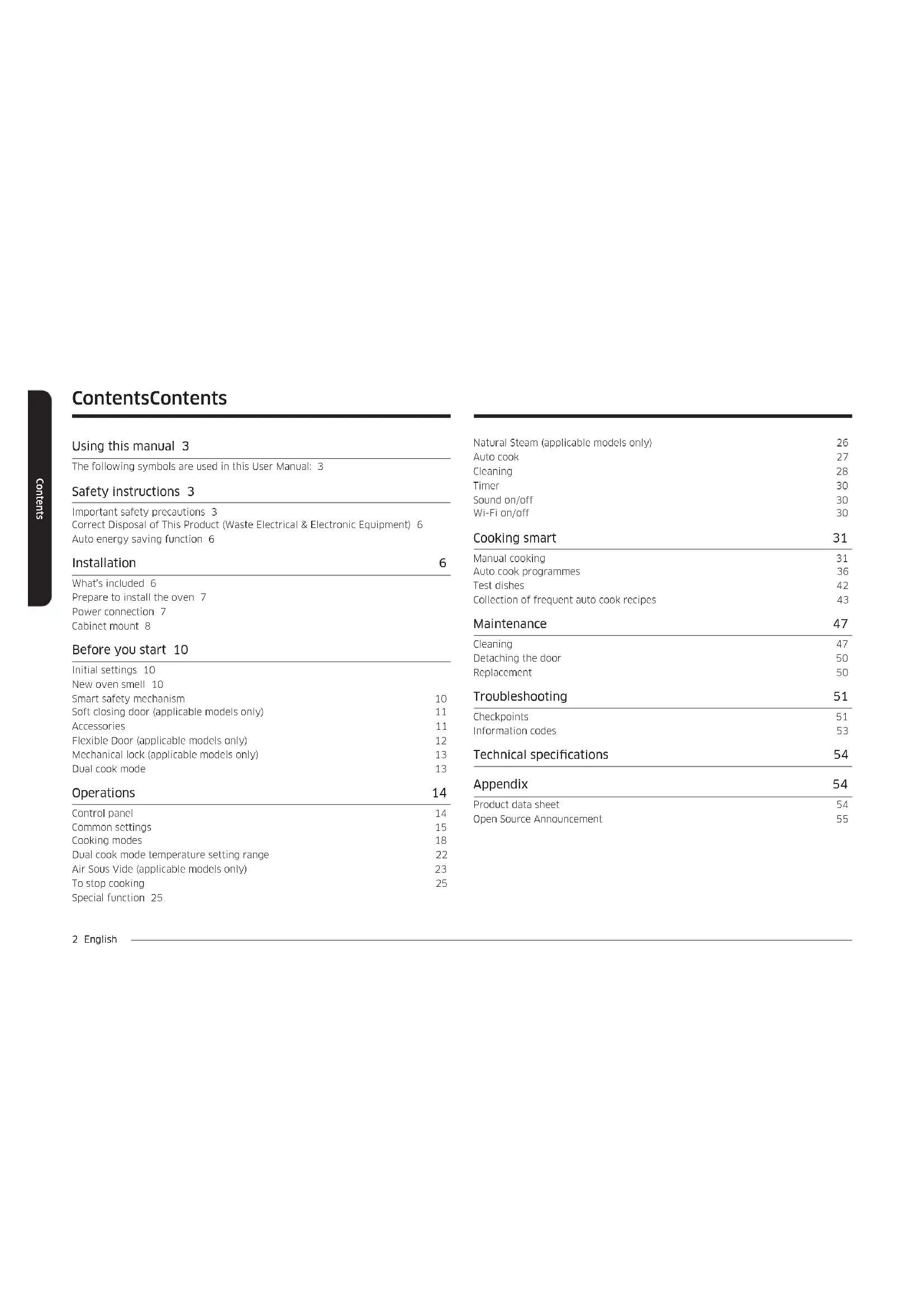 Product data sheet 54 Open Source Announcement 55English 3 Using this manual Safety instructions Thank you for choosing SAMSUNG Built-In Oven. This User Manual contains important information on safety and instructions intended to assist you in the operation and maintenance of your appliance. Please take the time to read this User Manual before using your oven and keep this book for future reference. The following symbols are used in this User Manual: WARNING Hazards or unsafe practices that may result in severe personal injury, death and/ or property damage. CAUTION Hazards or unsafe practices that may result in personal injury and/or property damage. NOTE Useful tips, recommendations, or information that helps users manipulate the product. Installation of this oven must be performed only by a licensed electrician. The installer is responsible for connecting the appliance to the mains power supply in observance of the relevant safety recommendations.