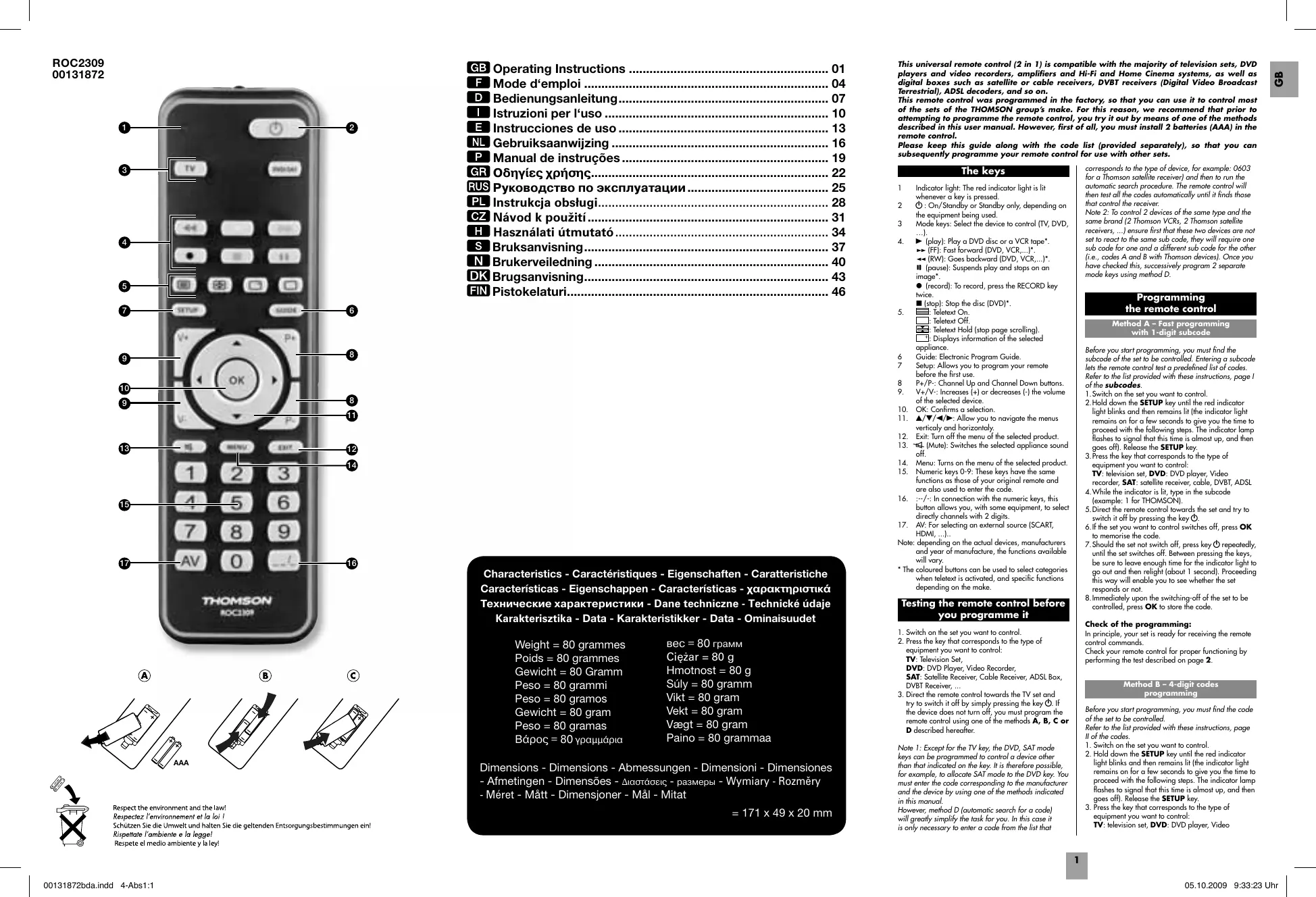 Characteristics - Caractéristiques - Eigenschaften - Caratteristiche Características - Eigenschappen - Características - χαρακτηριστικά Технические характеристики - Dane techniczne - Technické údaje Karakterisztika - Data - Karakteristikker - Data - Ominaisuudet Weight = 80 grammes Poids = 80 grammes Gewicht = 80 Gramm Peso = 80 grammi Peso = 80 gramos Gewicht = 80 gram Peso = 80 gramas Βάρoς = 80 γραμμάρια AAA вес = 80 грамм Ciężar = 80 g Hmotnost = 80 g Súly = 80 gramm Vikt = 80 gram Vekt = 80 gram Vægt = 80 gram Paino = 80 grammaa Dimensions - Dimensions - Abmessungen - Dimensioni - Dimensiones - Afmetingen - Dimensões - Διαστάσεις - размеры - Wymiary - Rozměry - Méret - Mått - Dimensjoner - Mål - Mitat = 171 x 49 x 20 mm This universal remote control (2 in 1) is compatible with the majority of television sets, DVD players and video recorders, amplifiers and Hi-Fi and Home Cinema systems, as well as digital boxes such as satellite or cable receivers, DVBT receivers (Digital Video Broadcast Terrestrial), ADSL decoders, and so on. This remote control was programmed in the factory, so that you can use it to control most of the sets of the THOMSON group’s make. For this reason, we recommend that prior to attempting to programme the remote control, you try it out by means of one of the methods described in this user manual. However, first of all, you must install 2 batteries (AAA) in the remote control. Please keep this guide along with the code list (provided separately), so that you can subsequently programme your remote control for use with other sets.