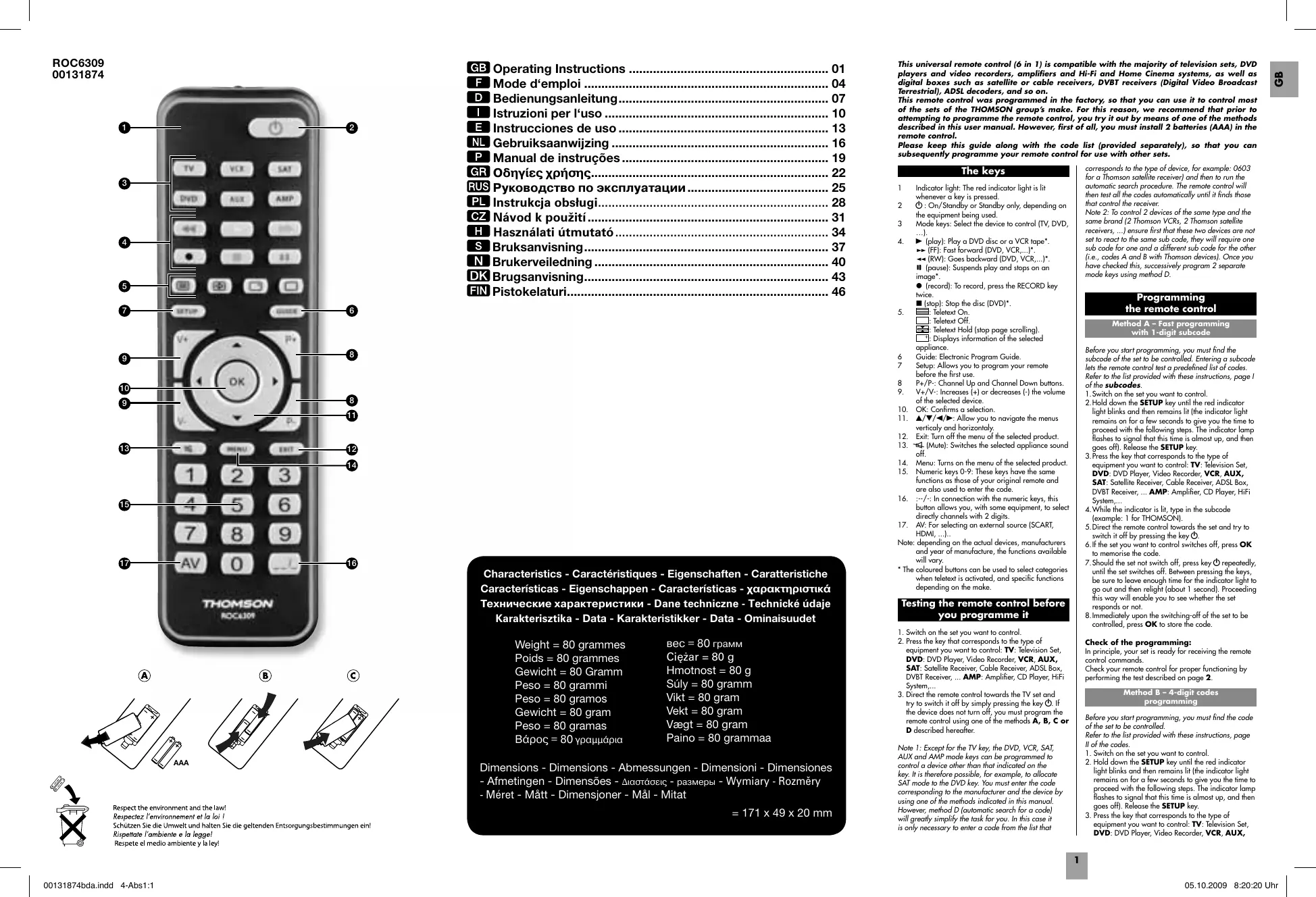 Characteristics - Caractéristiques - Eigenschaften - Caratteristiche Características - Eigenschappen - Características - χαρακτηριστικά Технические характеристики - Dane techniczne - Technické údaje Karakterisztika - Data - Karakteristikker - Data - Ominaisuudet Weight = 80 grammes Poids = 80 grammes Gewicht = 80 Gramm Peso = 80 grammi Peso = 80 gramos Gewicht = 80 gram Peso = 80 gramas Βάρoς = 80 γραμμάρια AAA вес = 80 грамм Ciężar = 80 g Hmotnost = 80 g Súly = 80 gramm Vikt = 80 gram Vekt = 80 gram Vægt = 80 gram Paino = 80 grammaa Dimensions - Dimensions - Abmessungen - Dimensioni - Dimensiones - Afmetingen - Dimensões - Διαστάσεις - размеры - Wymiary - Rozměry - Méret - Mått - Dimensjoner - Mål - Mitat = 171 x 49 x 20 mm This universal remote control (6 in 1) is compatible with the majority of television sets, DVD players and video recorders, amplifiers and Hi-Fi and Home Cinema systems, as well as digital boxes such as satellite or cable receivers, DVBT receivers (Digital Video Broadcast Terrestrial), ADSL decoders, and so on. This remote control was programmed in the factory, so that you can use it to control most of the sets of the THOMSON group’s make. For this reason, we recommend that prior to attempting to programme the remote control, you try it out by means of one of the methods described in this user manual. However, first of all, you must install 2 batteries (AAA) in the remote control. Please keep this guide along with the code list (provided separately), so that you can subsequently programme your remote control for use with other sets.