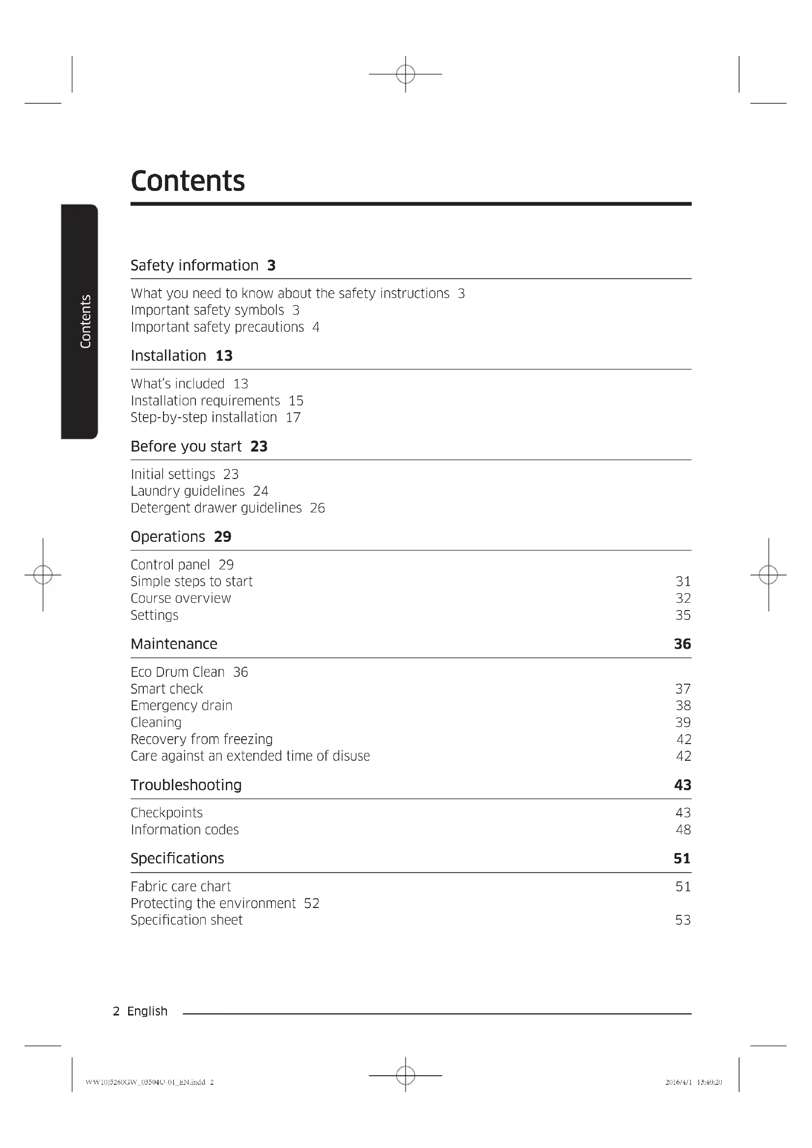 - Ensure that the power voltage, frequency, and current are the same as those of the product specications. Failure to do so may result in electric shock or re. Plug the power plug into the wall socket rmly. WW10J5260GW_03504U-01_EN.indd 5 2016/4/1 13:40:216 English Safety information Safety information Remove all foreign substances such as dust or water from the power plug terminals and contact points using a dry cloth on a regular basis.