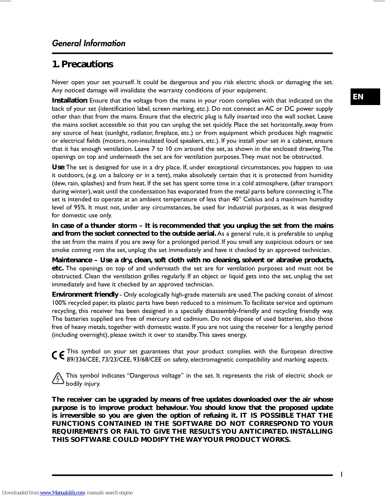 Installation: Ensure that the voltage from the mains in your room complies with that indicated on the back of your set (identification label, screen marking, etc.). Do not connect an AC or DC power supply other than that from the mains. Ensure that the electric plug is fully inserted into the wall socket. Leave the mains socket accessible so that you can unplug the set quickly. Place the set horizontally, away from any source of heat (sunlight, radiator, fireplace, etc.) or from equipment which produces high magnetic or electrical fields (motors, non-insulated loud speakers, etc.). If you install your set in a cabinet, ensure that it has enough ventilation. Leave 7 to 10 cm around the set, as shown in the enclosed drawing. The openings on top and underneath the set are for ventilation purposes. They must not be obstructed. Use: The set is designed for use in a dry place. If, under exceptional circumstances, you happen to use it outdoors, (e.g. on a balcony or in a tent), make absolutely certain that it is protected from humidity (dew, rain, splashes) and from heat. If the set has spent some time in a cold atmosphere, (after transport during winter), wait until the condensation has evaporated from the metal parts before connecting it.The set is intended to operate at an ambient temperature of less than 40° Celsius and a maximum humidity level of 95%. It must not, under any circumstances, be used for industrial purposes, as it was designed for domestic use only. In case of a thunder storm – It is recommended that you unplug the set from the mains and from the socket connected to the outside aerial. As a general rule, it is preferable to unplug the set from the mains if you are away for a prolonged period. If you smell any suspicious odours or see smoke coming rom the set, unplug the set immediately and have it checked by an approved technician. Maintenance – Use a dry, clean, soft cloth with no cleaning, solvent or abrasive products, etc. The openings on top of and underneath the set are for ventilation purposes and must not be obstructed. Clean the ventilation grilles regularly. If an object or liquid gets into the set, unplug the set immediately and have it checked by an approved technician. Environment friendly - Only ecologically high-grade materials are used. The packing consist of almost 100% recycled paper, its plastic parts have been reduced to a minimum. To facilitate service and optimum recycling, this receiver has been designed in a specially disassembly-friendly and recycling friendly way. The batteries supplied are free of mercury and cadmium. Do not dispose of used batteries, also those free of heavy metals, together with domestic waste. If you are not using the receiver for a lengthy period (including overnight), please switch it over to standby. This saves energy. This symbol on your set guarantees that your product complies with the European directive 89/336/CEE, 73/23/CEE, 93/68/CEE on safety, electromagnetic compatibility and marking aspects. This symbol indicates “Dangerous voltage” in the set. It represents the risk of electric shock or bodily injury. The receiver can be upgraded by means of free updates downloaded over the air whose purpose is to improve product behaviour. You should know that the proposed update is irreversible so you are given the option of refusing it. IT IS POSSIBLE THAT THE FUNCTIONS CONTAINED IN THE SOFTWARE DO NOT CORRESPOND TO YOUR REQUIREMENTS OR FAIL TO GIVE THE RESULTS YOU ANTICIPATED. INSTALLING THIS SOFTWARE COULD MODIFY THE WAY YOUR PRODUCT WORKS.