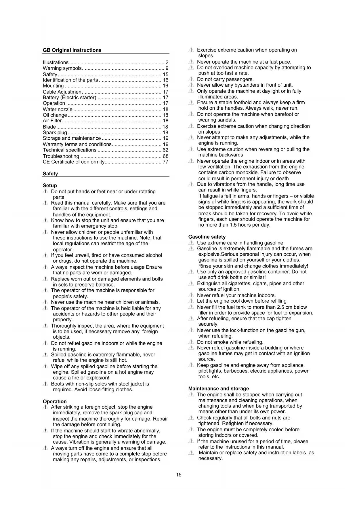 - Andre forhold, som Texas A/S er uden ansvar for Hvorvidt en sag er en garantisag eller ej, afgøres i hvert tilfælde af et autoriseret serviceværksted. Din købskvittering er gældende som garantibevis, hvorfor den altid bør gemmes. Husk: Ved anmodning om garanti reparation eller hjælp til reservedele, skal Art. no. (f.eks. 900665XX), årgang og serienummer altid oplyses. Det kan findes på CE-mærket som sidder på skjoldet bag motoren. *Vi forbeholder os ret til ændringer og tager forbehold for evt. trykfejl.15 GB Original instructions Illustrations ................................................................... 2 Warning symbols .......................................................... 9 Safety ......................................................................... 15 Identification of the parts ............................................ 16 Mounting .................................................................... 16 Cable Adjustment ....................................................... 17 Battery (Electric starter) ............................................. 17 Operation ................................................................... 17 Water nozzle .............................................................. 18 Oil change .................................................................. 18 Air Filter ...................................................................... 18 Blade .......................................................................... 18 Spark plug .................................................................. 18 Storage and maintenance .......................................... 19 Warranty terms and conditions ................................... 19 Technical specifications ............................................. 62 Troubleshooting ......................................................... 68 CE Certificate of conformity ........................................ 77 Safety Setup Do not put hands or feet near or under rotating parts. Read this manual carefully. Make sure that you are familiar with the different controls, settings and handles of the equipment. Know how to stop the unit and ensure that you are familiar with emergency stop. Never allow children or people unfamiliar with these instructions to use the machine. Note, that local regulations can restrict the age of the operator. If you feel unwell, tired or have consumed alcohol or drugs, do not operate the machine. Always inspect the machine before usage Ensure that no parts are worn or damaged. Replace worn out or damaged elements and bolts in sets to preserve balance. The operator of the machine is responsible for people’s safety. Never use the machine near children or animals. The operator of the machine is held liable for any accidents or hazards to other people and their property. Thoroughly inspect the area, where the equipment is to be used, if necessary remove any foreign objects. Do not refuel gasoline indoors or while the engine is running. Spilled gasoline is extremely flammable, never refuel while the engine is still hot. Wipe off any spilled gasoline before starting the engine. Spilled gasoline on a hot engine may cause a fire or explosion! Boots with non-slip soles with steel jacket is required. Avoid loose-fitting clothes. Operation After striking a foreign object, stop the engine immediately, remove the spark plug cap and inspect the machine thoroughly for damage. Repair the damage before continuing. If the machine should start to vibrate abnormally, stop the engine and check immediately for the cause. Vibration is generally a warning of damage. Always turn off the engine and ensure that all moving parts have come to a complete stop before making any repairs, adjustments, or inspections. Exercise extreme caution when operating on slopes. Never operate the machine at a fast pace. Do not overload machine capacity by attempting to push at too fast a rate. Do not carry passengers. Never allow any bystanders in front of unit. Only operate the machine at daylight or in fully illuminated areas. Ensure a stable foothold and always keep a firm hold on the handles. Always walk, never run. Do not operate the machine when barefoot or wearing sandals. Exercise extreme caution when changing direction on slopes Never attempt to make any adjustments, while the engine is running. Use extreme caution when reversing or pulling the machine backwards Never operate the engine indoor or in areas with low ventilation. The exhaustion from the engine contains carbon monoxide. Failure to observe could result in permanent injury or death. Due to vibrations from the handle, long time use can result in white fingers. If fatigue is felt in arms, hands or fingers – or visible signs of white fingers is appearing, the work should be stopped immediately and a sufficient time of break should be taken for recovery. To avoid white fingers, each user should operate the machine for no more than 1.5 hours per day. Gasoline safety Use extreme care in handling gasoline. Gasoline is extremely flammable and the fumes are explosive.Serious personal injury can occur, when gasoline is spilled on yourself or your clothes. Rinse your skin and change clothes immediately! Use only an approved gasoline container. Do not use soft drink bottle or similar! Extinguish all cigarettes, cigars, pipes and other sources of ignition. Never refuel your machine indoors. Let the engine cool down before refilling Never fill the fuel tank to more than 2.5 cm below filler in order to provide space for fuel to expansion. After refueling, ensure that the cap tighten securely. Never use the lock-function on the gasoline gun, when refueling. Do not smoke while refueling. Never refuel gasoline inside a building or where gasoline fumes may get in contact with an ignition source. Keep gasoline and engine away from appliance, pilot lights, barbecues, electric appliances, power tools, etc. Maintenance and storage The engine sh