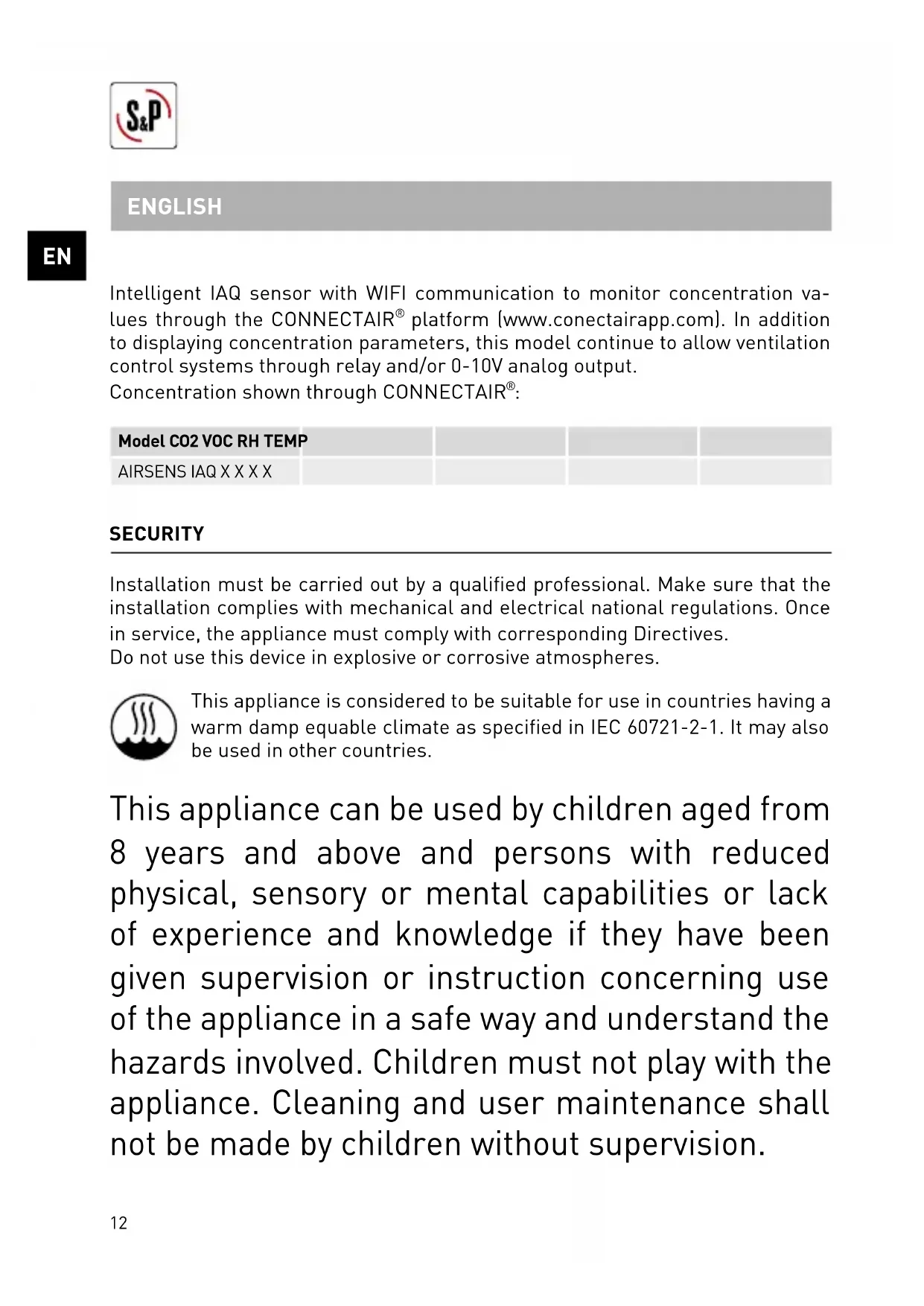 SECURITY Installation must be carried out by a qualified professional. Make sure that the installation complies with mechanical and electrical national regulations. Once in service, the appliance must comply with corresponding Directives. Do not use this device in explosive or corrosive atmospheres. This appliance is considered to be suitable for use in countries having a warm damp equable climate as specified in IEC 60721-2-1. It may also be used in other countries. This appliance can be used by children aged from 8 years and above and persons with reduced physical, sensory or mental capabilities or lack of experience and knowledge if they have been given supervision or instruction concerning use of the appliance in a safe way and understand the hazards involved. Children must not play with the appliance. Cleaning and user maintenance shall not be made by children without supervision. ENGLISH13