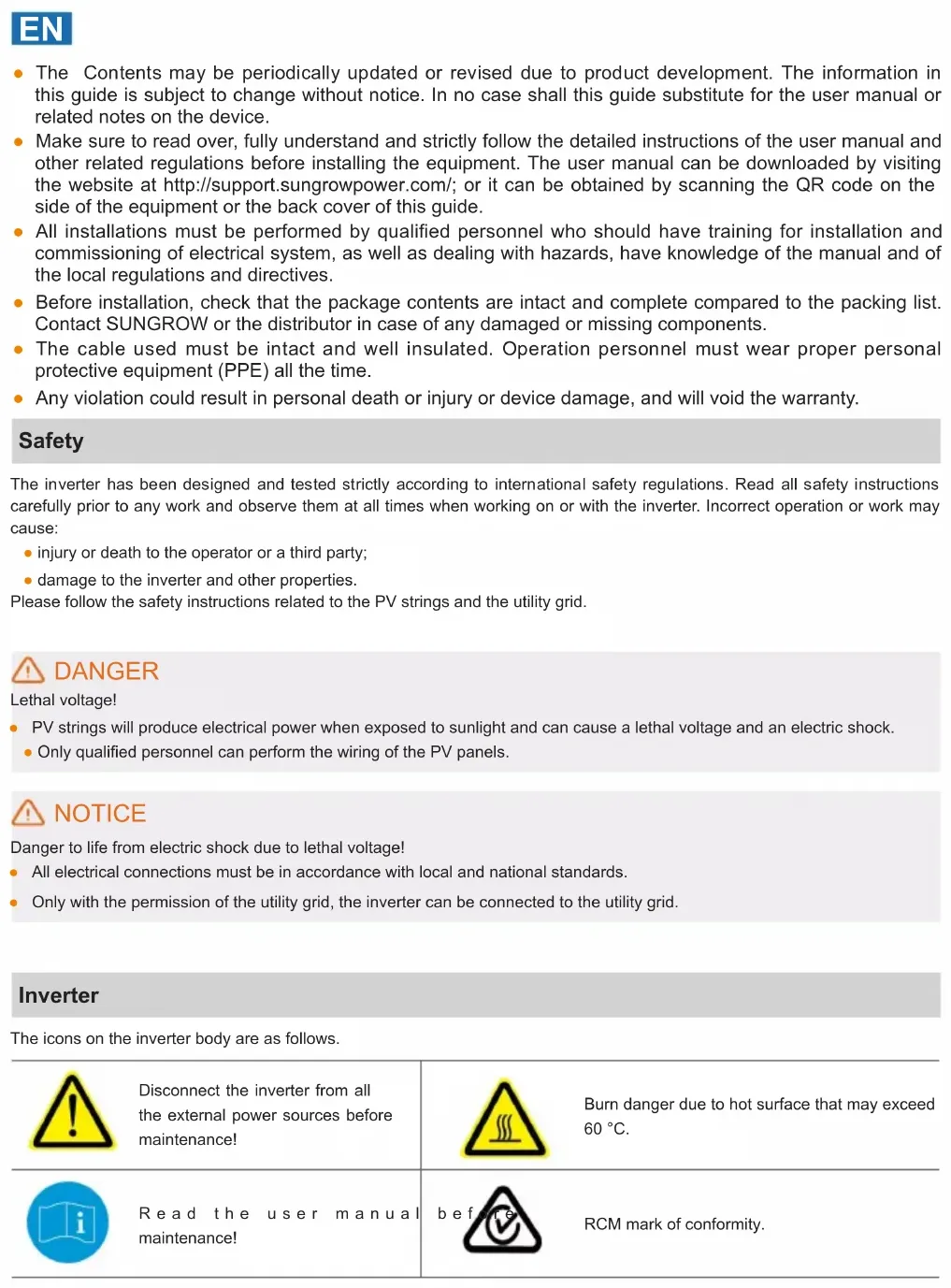 ● The Contents may be periodically updated or revised due to product development. The information in this guide is subject to change without notice. In no case shall this guide substitute for the user manual or related notes on the device. ● Make sure to read over, fully understand and strictly follow the detailed instructions of the user manual and other related regulations before installing the equipment. The user manual can be downloaded by visiting the website at http://support.sungrowpower.com/; or it can be obtained by scanning the QR code on the side of the equipment or the back cover of this guide. ● All installations must be performed by qualied personnel who should have training for installation and commissioning of electrical system, as well as dealing with hazards, have knowledge of the manual and of the local regulations and directives. ● Before installation, check that the package contents are intact and complete compared to the packing list. Contact SUNGROW or the distributor in case of any damaged or missing components. ● The cable used must be intact and well insulated. Operation personnel must wear proper personal protective equipment (PPE) all the time. ● Any violation could result in personal death or injury or device damage, and will void the warranty. Safety The inverter has been designed and tested strictly according to international safety regulations. Read all safety instructions carefully prior to any work and observe them at all times when working on or with the inverter. Incorrect operation or work may cause: ● injury or death to the operator or a third party; ● damage to the inverter and other properties. Please follow the safety instructions related to the PV strings and the utility grid. DANGER Lethal voltage! ● PV strings will produce electrical power when exposed to sunlight and can cause a lethal voltage and an electric shock. ● Only qualied personnel can perform the wiring of the PV panels. NOTICE Danger to life from electric shock due to lethal voltage! ● All electrical connections must be in accordance with local and national standards. ● Only with the permission of the utility grid, the inverter can be connected to the utility grid. Inverter The icons on the inverter body are as follows. Disconnect the inverter from all the external power sources before maintenance! Burn danger due to hot surface that may exceed 60 °C. R e a d t h e u s e r m a n u a l b e f o r e maintenance! RCM mark of conformity.2 Danger to life due to high voltages! Only qualified personnel can open and maintain the inverter. Danger to life due to high voltages! Do not touch live parts for 10 minutes after disconnection from the power sources. Only qualied personnel can open and service the inverter. TÜV mark of conformity. CE mark of conformity. EU/EEA Importer. Do not dispose of the inverter together with household waste. The inverter does not have a transformer. Additional grounding point. UKCA mark of conformity. RoHS labeling The p r o d uct compl i e s with the requirements of the applicable EU directives. CMIM-Prüfzeichen. Users may also attach other warning signs as per the requirements of the local standards or installation specications. Security Declaration ● For details on the product's network security vulnerability response process and vulnerability disclosure, please scan the QR code on the right or visit the following website: https://en.sungrowpower.com/security-vulnerability-management ● For more information on network security, please refer to the user manual of the communication module or the Data Logger that comes with the product. EU Declaration of Conformity within the scope of the EU directives: ● Low Voltage Directive 2014/35/EU (LVD) ● Electromagnetic compatibility Directive 2014/30/EU (EMC) ● Restriction of the use of certain hazardous substances 2011/65/EU and 2015/863/EU (RoHS) ● The manufacturer Sungrow Power Supply Co., Ltd, China hereby conrms that the product SG3.0-20RT&SG5.0-20RT-P2 complies with the essential requirements and other relevant provisions of Directives 2014/35/EU, 2014/30/EU, 2011/65/ EU, 2015/863/EU. The full EU Declaration of Conformity can be found at https://support.sungrowpower.com/PdfDetail? id=1697881433535078402. ● The communication module that comes with the inverter and the technical parameters of wireless communication are listed in the table below. The model of the communication module actually delivered shall prevail. The EU Declaration of Conformity for the communication module can be found at support.sungrowpower.com . WiNet-S/WiNet-S2:3 Technologie radio WLANI 802.11b/g/n20/n40 Radio spectrum 802.11b/g/n 802.11n40 2412 MHz ~ 2472 MHz 2422 MHz ~ 2462 MHz Maximum transmitted power ≤ 20 dBm Technical parameters listed above apply to EU countries only. Manufacturer: Sungrow Power Supply Co., Ltd. No 1699. Xiyou Road,Hefei 230088.P.R China For EU only EU/EEA lmporter: Sungrow DeutschIand GmbH BaIanstraße 59, 81541 München, Germany DANGER Danger to life from electric shocks due to live voltage ● Do not open the enclosure at any time. Unauthorized opening will void warranty and warranty claims and in most cases terminate the operating license. ● When the enclosure lid is removed, live components can be touched which can result in death or serious injury due to electric shock. Lethal danger from electric shock due to possibly damaged inverter ● Only operate the inverter when it is technically faultless and in a safe state. ● Operating a damaged inverter can lead to hazardous situations that can result in death or serious injuries due to electric shock. WARNING Risk of inverter damage or personal injury ● Do not connect or disconnect the PV and AC connectors when the inverter is running. ● Wait at least 10 minutes for the internal capacitors to discharge after all electric devices are removed and the inverter is powered o. ● Ensure that there is no voltage or current 