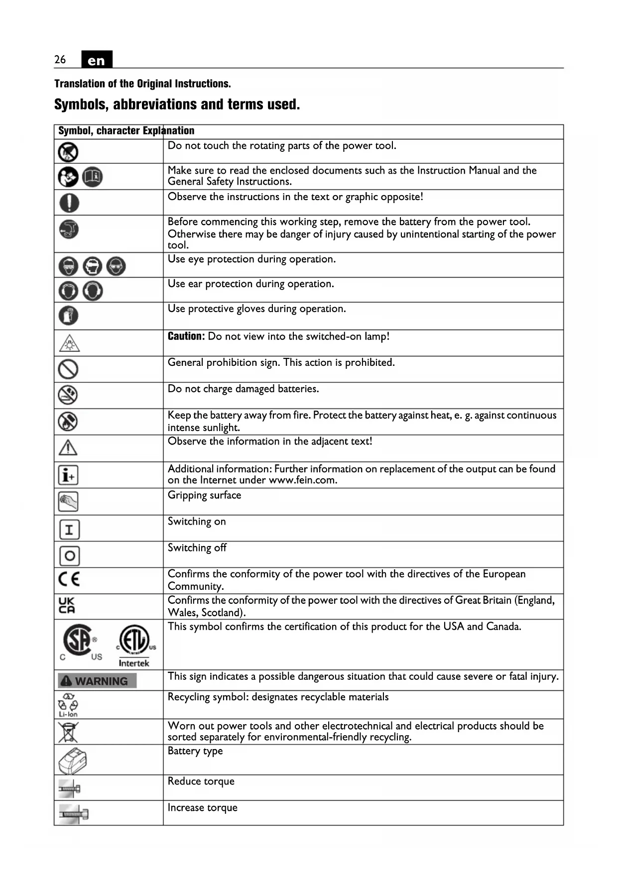 Translation of the Original Instructions. Symbols, abbreviations and terms used. Symbol, character Explanation Do not touch the rotating parts of the power tool. Make sure to read the enclosed documents such as the Instruction Manual and the General Safety Instructions. Observe the instructions in the text or graphic opposite! Before commencing this working step, remove the battery from the power tool. Otherwise there may be danger of injury caused by unintentional starting of the power tool. Use eye protection during operation. Use ear protection during operation. Use protective gloves during operation. Caution: Do not view into the switched-on lamp! General prohibition sign. This action is prohibited. Do not charge damaged batteries. Keep the battery away from fire. Protect the battery against heat, e. g. against continuous intense sunlight. Observe the information in the adjacent text! Additional information: Further information on replacement of the output can be found on the Internet under www.fein.com. Gripping surface Switching on Switching off Confirms the conformity of the power tool with the directives of the European Community. Confirms the conformity of the power tool with the directives of Great Britain (England, Wales, Scotland). This symbol confirms the certification of this product for the USA and Canada. This sign indicates a possible dangerous situation that could cause severe or fatal injury. Recycling symbol: designates recyclable materials Worn out power tools and other electrotechnical and electrical products should be sorted separately for environmental-friendly recycling. Battery type Reduce torque Increase torque WARNING27