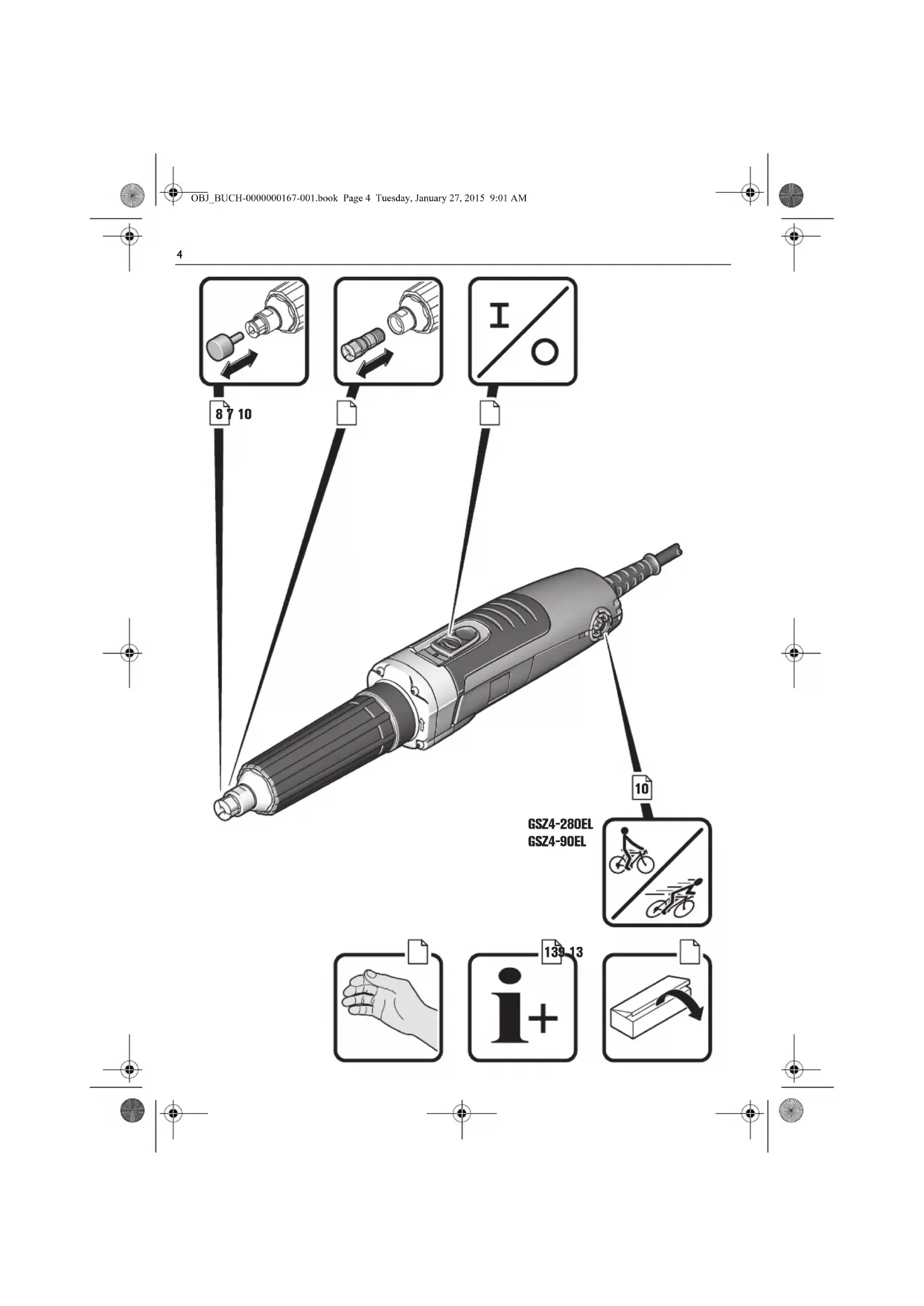 This may significantly increase the exposure level over the total working period. An estimation of the level of exposure to vibration should also take into account the times when the tool is switched off or when it is running but not actually doing the job. This may significantly reduce the exposure level over the total working period. Identify additional safety measures to protect the opera- tor from the effects of vibration such as: maintain the tool and the accessories, keep the hands warm, organisation of work patterns. The vibrational emission values are given for dry grinding of metal with grinding points. Other applications, such as shaping with hard metal cutters, can lead to other vibra- tional emission values. Handling hazardous dusts For work procedures with this power tool where mate- rial is removed, dusts develop that can be hazardous to one’s health. Contact with or inhaling some dust types, e. g. asbestos and asbestos-containing materials, lead-containing coat- ings, metal, some wood types, minerals, silicate particles from materials containing stone, paint solvents, wood preservatives, antifouling paints for vessels, can trigger allergic reactions to the operator or bystanders and/or lead to respiratory infections, cancer, birth defects or other reproductive harm. The risk from inhaling dusts depends on the exposition. Use dust extraction matched appropriately for the developing dust, as well as personal protective equipment and provide for good ventilation of the workplace. Leave the processing of asbestos-contain- ing materials to specialists. Wood and light-metal dust, hot mixtures of grinding dust and chemical materials can self-ignite under unfavourable conditions or cause an explosion. Avoid sparking in the direction of the dust collector as well as overheating of the power tool and the materials being sanded, empty the dust collector/container in time, observe the material manufacturer’s working instructions, as well as the rele- vant regulations in your country for the materials being worked. Operating Instructions. The self-start lock (for GSZ8..., GSZ11...) prevents the straight grinder from automatically restarting again, even after a brief interruption of the power supply during operation, e. g., from a pulled mains plug. The straight grinder is fitted with overload and blocking protection (for models GSZ8..., GSZ11...). In case of overload or blocking of the application tool, the power supply is interrupted. In this case, switch the power tool off, remove it from the workpiece and check the applica- tion tool. Afterwards, switch the power tool on again. Use a collet that fits the grinding accessory. Insert the clamping shaft of the grinding accessory to the stop into the collet chuck. Observe the maximum permitted projecting shaft length (a) of the grinding accessory according to the manufac- turer’s instructions (see page 13). Move the power tool back and forth applying uniform pressure, so that the workpiece surface does not become too hot. Repair and customer service. When working metal under extreme operat- ing conditions, it is possible for conductive dust to settle in the interior of the power tool. The total insulation of the power tool can be impaired. Blow out the interior of the power tool via the ventila- tion slots frequently with dry and oil-free compressed air, and connect a residual current device (RCD) on the line side. If the supply cord of this power tool is damaged, it must be replaced by a specially prepared cord available through the FEIN customer service centre. The current spare parts list for this power tool can be found in the Internet at www.fein.com. If required, you can change the following parts yourself: Application tools, collet Warranty and liability. The warranty for the product is valid in accordance with the legal regulations in the country where it is marketed. In addition, FEIN also provides a guarantee in accordance with the FEIN manufacturer’s warranty declaration. The delivery scope of your power tool may include only a part of the accessories described or shown in this Instruction Manual. Declaration of conformity. FEIN declares itself solely responsible for this product conforming with the relevant provisions given on the last page of this Instruction Manual. Technical documents at: C. & E. Fein GmbH, C-DB_IA, D-73529 Schwäbisch Gmünd Environmental protection, disposal. Packaging, worn out power tools and accessories should be sorted for environmental-friendly recycling. Selection of accessories (see page 13). Use only original FEIN accessories. The accessories must be intended for the power tool type. A Collet OBJ_BUCH-0000000167-001.book Page 24 Tuesday, January 27, 2015 9:01 AM25