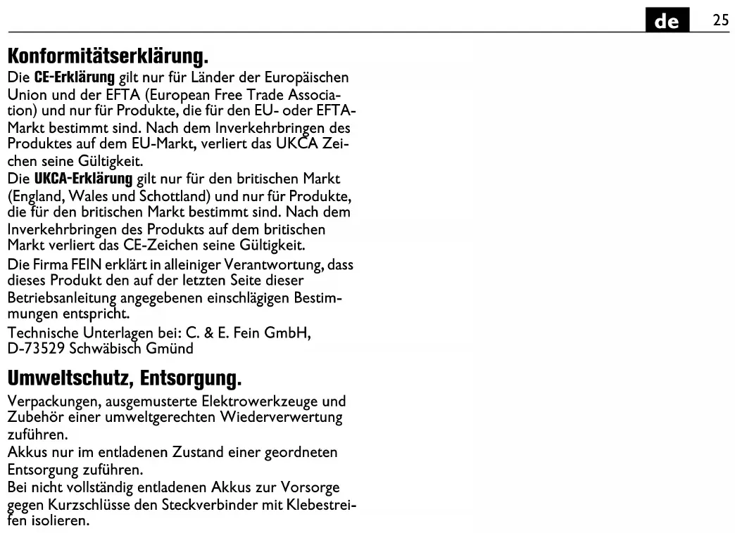 Parameter assignment Differing to the existing standard programs, the Accu- Tec screwdrivers can be freely programmed in some ranges. To realise these special solutions, an additional PC program is required for assignment of the parame- ters. Afterwards, the data can be transferred to the screwdriver with the programming adapter. The cur- rent software can be downloaded from FEIN via the Internet under www.fein.com. It can be found in the country-specific AccuTec sector. A link to this section is provided on the included USB card of the separately available programming adapter. We recommend that you keep the firmware on your AccuTec screwdrivers up-to-date. Repair and customer service. When working metal under extreme oper- ating conditions, it is possible for conductive dust to settle in the interior of the power tool. Blow out the interior of the power tool via the ventilation slots frequently with dry and oil-free com- pressed air. Regularly check the condition of the power tool and arrange for necessary maintenance or repair work in good time. The service life of the machine, battery and accessories (e.g. angle head and application tool) depends on the load and application of the machine. Products that have come into contact with asbestos may not be sent in for repair. Dispose of products con- taminated with asbestos according to the applicable country-specific regulations for such disposal. The current spares parts list for this power tool can be found on our website at www.fein.com. Use only original spare parts. If required, you can change the following parts your- self: Application tools, battery pack, accessories Warranty and liability. The warranty for the product is valid in accordance with the legal regulations in the country where it is mar- keted. In addition, FEIN also provides a guarantee in accordance with the FEIN manufacturer’s warranty dec- laration. The delivery scope of your power tool may include only a part of the accessories described or shown in this Instruction Manual. Declaration of conformity. This CE declaration is only valid for European Union and EFTA (European Free Trade Association) countries and only for products intended for the EU- or EFTA market. After placing the product on the EU market the UKCA mark loses its mark validity. The UKCA declaration is only valid for the Great Britain market (England, Wales and Scotland) and only for products intended for the Great Britain market. After placing the product on the Great Britain market the CE mark loses its mark validity. FEIN declares itself solely responsible for this product conforming with the relevant provisions given on the last page of this Instruction Manual. Technical documents at: C. & E. Fein GmbH, D-73529 Schwäbisch Gmünd Environmental protection, disposal. Packaging, worn out power tools and accessories should be sorted for environmental-friendly recycling. Dispose of batteries only when discharged. For batteries that are not completely discharged, insu- late the terminals with tape as a protective measure against short-circuiting. Red LED indicator flashes (2 times per sec- ond). The machine is overheated, the over-tempera- ture protection has responded. After cooling down, the machine is ready for operation again. If the over-temperature protection responds several times briefly after each other, have the power tool checked by the after-sales service. Red LED indicator flashes (1 times per sec- ond). Yellow LED indicator flashes (1 time per sec- ond). The battery type is not suitable for this screw- driving application. Recommendation: For soft screwdriving applica- tions at high torque, use a battery with higher capacity. Brief flashing of all LED indicators. The cordless screwdriver switches to the Energy Saving Mode. LED indicator Meaning Explanation31