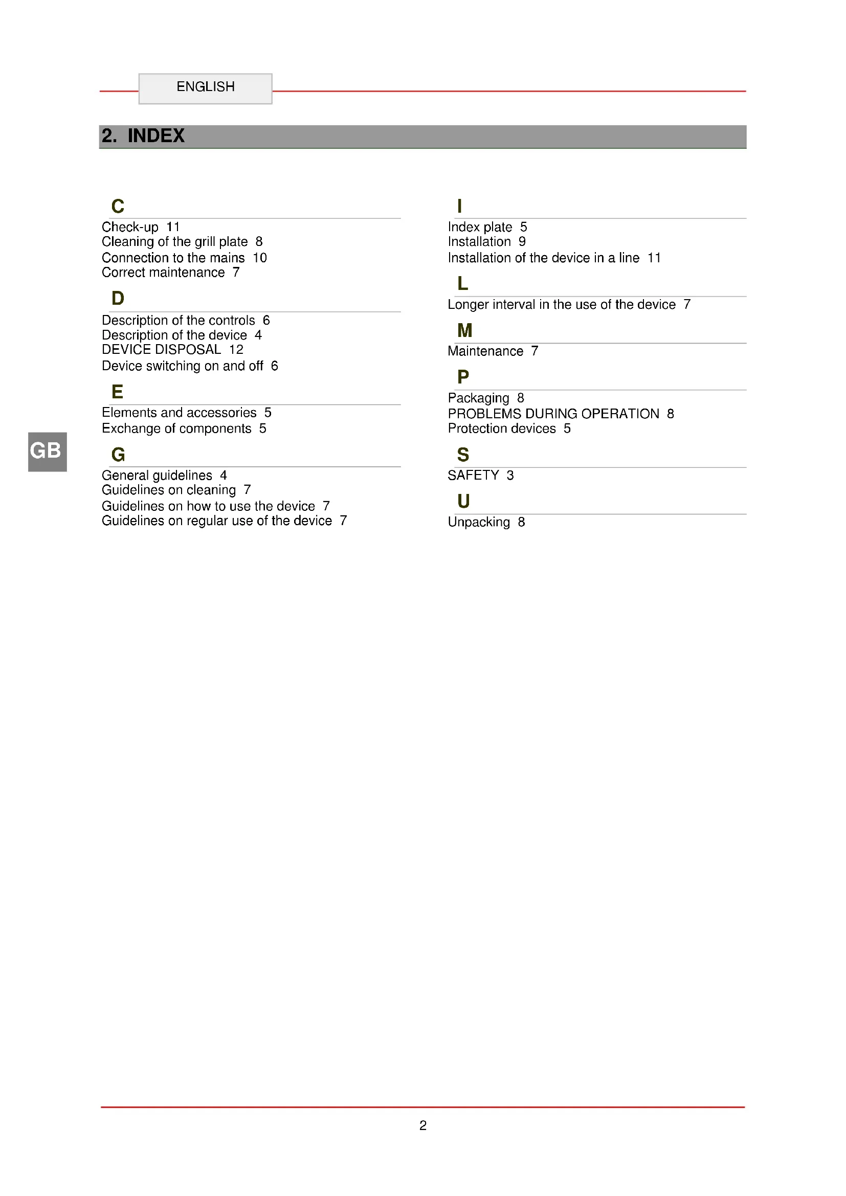 Check-up 11 Cleaning of the grill plate 8 Connection to the mains 10 Correct maintenance 7
