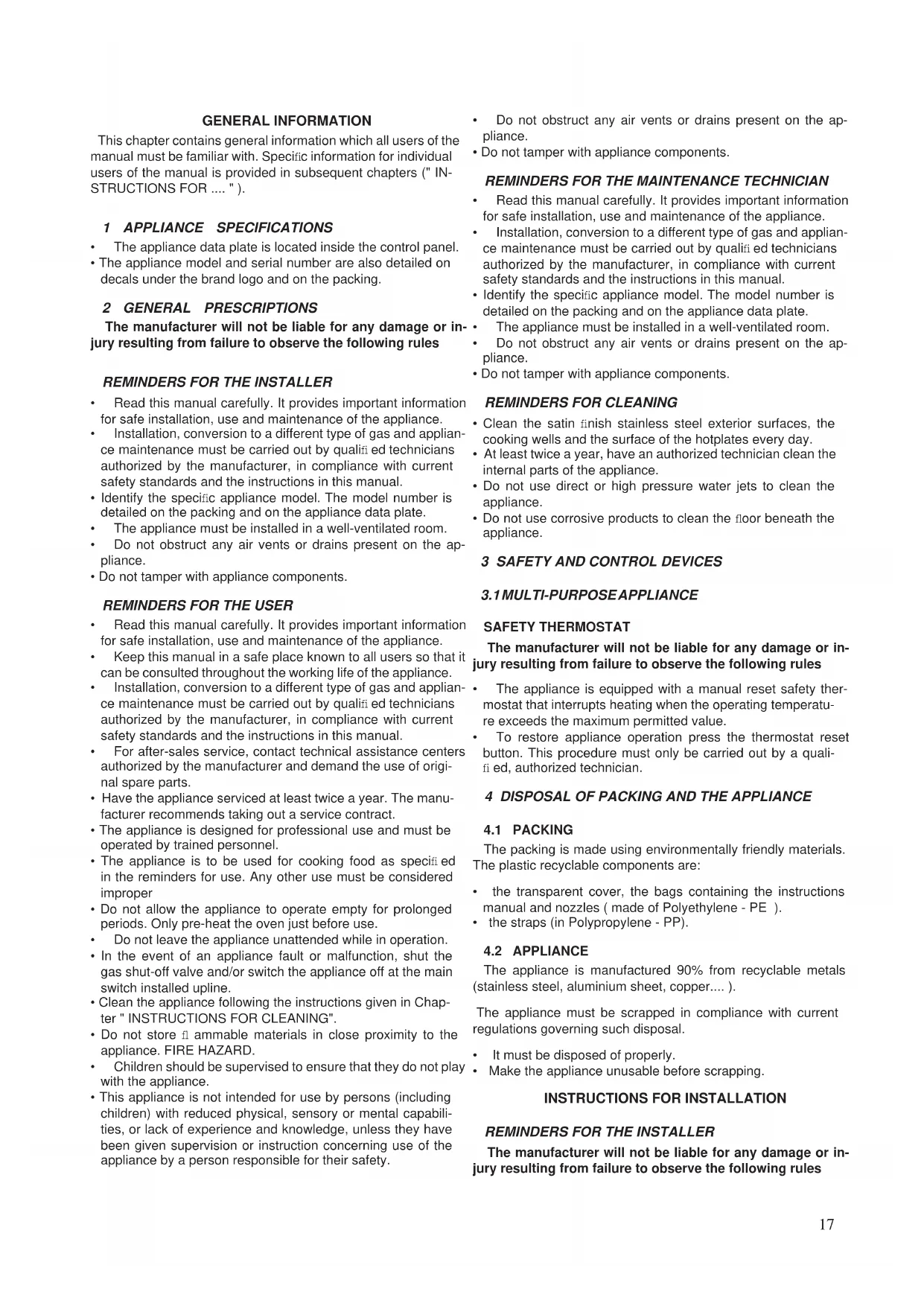 - Installation, conversion to a different type of gas and applian- ce maintenance must be carried out by qualifi ed technicians authorized by the manufacturer, in compliance with current safety standards and the instructions in this manual.19