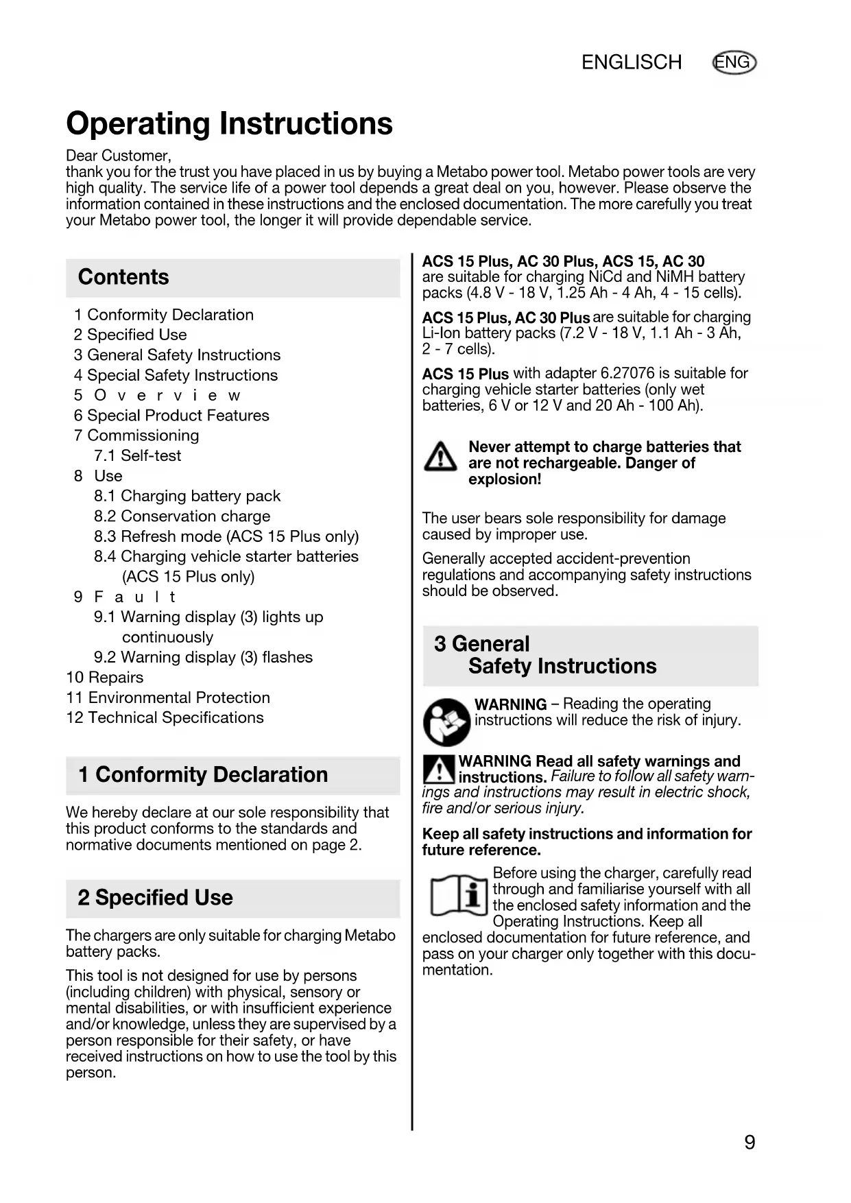 ACS 15 Plus with adapter 6.27076 is suitable for charging vehicle starter batteries (only wet batteries, 6 V or 12 V and 20 Ah - 100 Ah). Never attempt to charge batteries that are not rechargeable. Danger of explosion! The user bears sole responsibility for damage caused by improper use. Generally accepted accident-prevention regulations and accompanying safety instructions should be observed. WARNING – Reading the operating instructions will reduce the risk of injury. WARNING Read all safety warnings and instructions. Failure to follow all safety warn- ings and instructions may result in electric shock, fire and/or serious injury. Keep all safety instructions and information for future reference. Before using the charger, carefully read through and familiarise yourself with all the enclosed safety information and the Operating Instructions. Keep all enclosed documentation for future reference, and pass on your charger only together with this docu- mentation. Operating Instructions Dear Customer, thank you for the trust you have placed in us by buying a Metabo power tool. Metabo power tools are very high quality. The service life of a power tool depends a great deal on you, however. Please observe the information contained in these instructions and the enclosed documentation. The more carefully you treat your Metabo power tool, the longer it will provide dependable service. Contents 1 Conformity Declaration 2 Specified Use 3 General Safety Instructions 17024963_0309 ACS 15 AC 30.book Seite 9 Mittwoch, 4. März 2009 4:29 1610 ENGLISCH ENG For your own protection and for the protection of your charger pay attention to all parts of the text that are marked with this symbol! Danger - electrical voltage! Caustic fluid may leak from defective NiCd or NiMH battery packs (30% caustic potash solution)! Slightly acidic, flammable fluid may leak from defective Li-Ion battery packs! If battery fluid from NiCd, NiMH or Li-Ion battery packs leaks out and comes into contact with the skin, rinse the affected area thoroughly with water. If battery fluid leaks out and comes into contact with your eyes, wash them with clean water and seek medical treatment immediately! Do not recharge a fully charged battery pack! Overcharging damages and shortens the lifespan of the battery pack! Only use the charger indoors. Protect the charger from moisture. Children should be supervised to ensure that they do not play with the tool. Keep children away from the battery charger and the working area! Keep your battery charger out of reach of children! Pull out the mains plug immediately if the battery charger starts to smoke or flames emerge! Do not insert objects into the ventilation slots on the battery charger - there is a danger of electric shocks and short circuits! Do not use faulty battery packs. See page 3 (please unfold). 1 Charging compartment 2 Operating indicator 3 Warning display 4 Refresh mode button 5 Refresh mode indicator