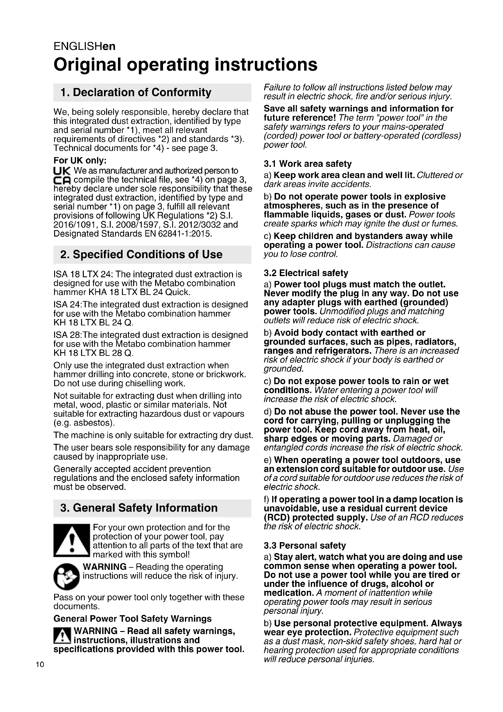 ISA 18 LTX 24: The integrated dust extraction is designed for use with the Metabo combination hammer KHA 18 LTX BL 24 Quick. ISA 24:The integrated dust extraction is designed for use with the Metabo combination hammer KH 18 LTX BL 24 Q. ISA 28:The integrated dust extraction is designed for use with the Metabo combination hammer KH 18 LTX BL 28 Q. Only use the integrated dust extraction when hammer drilling into concrete, stone or brickwork. Do not use during chiselling work. Not suitable for extracting dust when drilling into metal, wood, plastic or similar materials. Not suitable for extracting hazardous dust or vapours (e.g. asbestos). The machine is only suitable for extracting dry dust. The user bears sole responsibility for any damage caused by inappropriate use. Generally accepted accident prevention regulations and the enclosed safety information must be observed. For your own protection and for the protection of your power tool, pay attention to all parts of the text that are marked with this symbol! WARNING – Reading the operating instructions will reduce the risk of injury. Pass on your power tool only together with these documents. General Power Tool Safety Warnings WARNING – Read all safety warnings, instructions, illustrations and specifications provided with this power tool. Failure to follow all instructions listed below may result in electric shock, fire and/or serious injury. Save all safety warnings and information for future reference! The term "power tool" in the safety warnings refers to your mains-operated (corded) power tool or battery-operated (cordless) power tool.