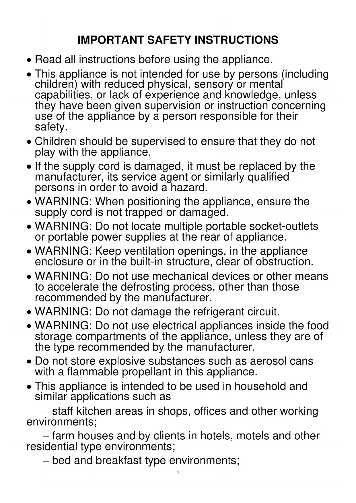 storage compartments of the appliance, unless they are of the type recommended by the manufacturer. Do not store explosive substances such as aerosol cans with a flammable propellant in this appliance. This appliance is intended to be used in household and similar applications such as – staff kitchen areas in shops, offices and other working environments; – farm houses and by clients in hotels, motels and other residential type environments; – bed and breakfast type environments;3 – catering and similar non-retail applications. Plug into a grounded 3-prong outlet. Do not remove grounding prong, do not use an adapter, and do not use an extension cord. It is recommended that a separate circuit, serving only your appliance, be provided. Use receptacles that cannot be turned off by a switch or pull chain. Never clean appliance parts with flammable fluids. These fumes can create a fire hazard or explosion. Before proceeding with cleaning and maintenance operations, make sure the power line of the unit is disconnected. Do not connect or disconnect the electric plug when your hands are wet. Unplug the appliance or disconnect the power before cleaning or servicing. Failure to do so can result in electrical shock or death. Do not attempt to repair or replace any part of your appliance unless it is specifically recommended in this manual. All other servicing should be referred to a qualified technician. Do not store or use gasoline or any other flammable vapors and liquids in the vicinity of this or any other appliance. The fumes can create a fire hazard or explosion. Use two or more people to move/install the refrigerator. Failure to do so can result in back or other injury. To ensure proper ventilation for your appliance, the front of the unit must be completely unobstructed. Choose a well-ventilated area with temperatures above 50