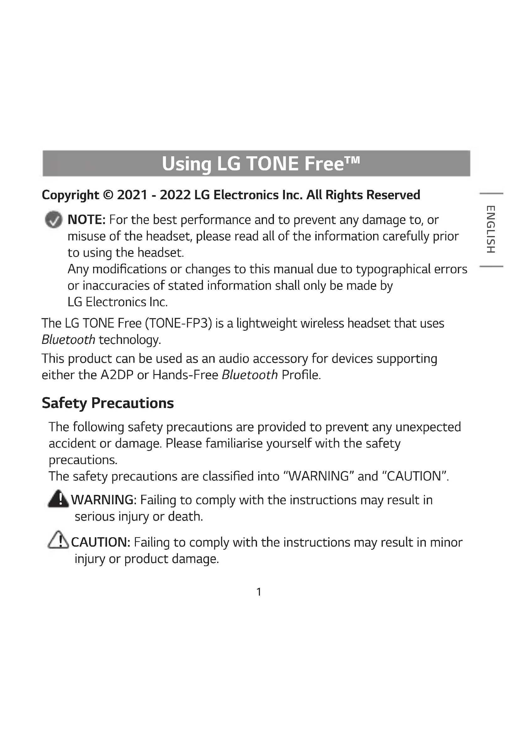 Copyright © 2021 - 2022 LG Electronics Inc. All Rights Reserved NOTE: For the best performance and to prevent any damage to, or misuse of the headset, please read all of the information carefully prior to using the headset. Any modications or changes to this manual due to typographical errors or inaccuracies of stated information shall only be made by LG Electronics Inc. The LG TONE Free (TONE-FP3) is a lightweight wireless headset that uses Bluetooth technology. This product can be used as an audio accessory for devices supporting either the A2DP or Hands-Free Bluetooth Prole. Safety Precautions The following safety precautions are provided to prevent any unexpected accident or damage. Please familiarise yourself with the safety precautions. The safety precautions are classied into “WARNING” and “CAUTION”.