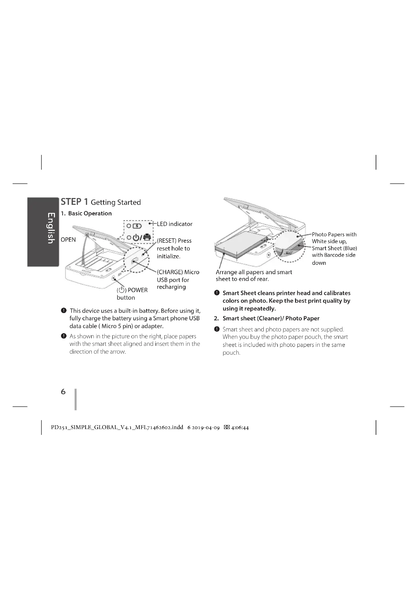 (RESET) Press reset hole to initialize. LED indicator (1) POWER button (CHARGE) Micro USB port for recharging OPEN , This device uses a built-in battery. Before using it, fully charge the battery using a Smart phone USB data cable ( Micro 5 pin) or adapter. , As shown in the picture on the right, place papers with the smart sheet aligned and insert them in the direction of the arrow. Photo Papers with White side up, Smart Sheet (Blue) with Barcode side down Arrange all papers and smart sheet to end of rear. , Smart Sheet cleans printer head and calibrates colors on photo. Keep the best print quality by using it repeatedly.