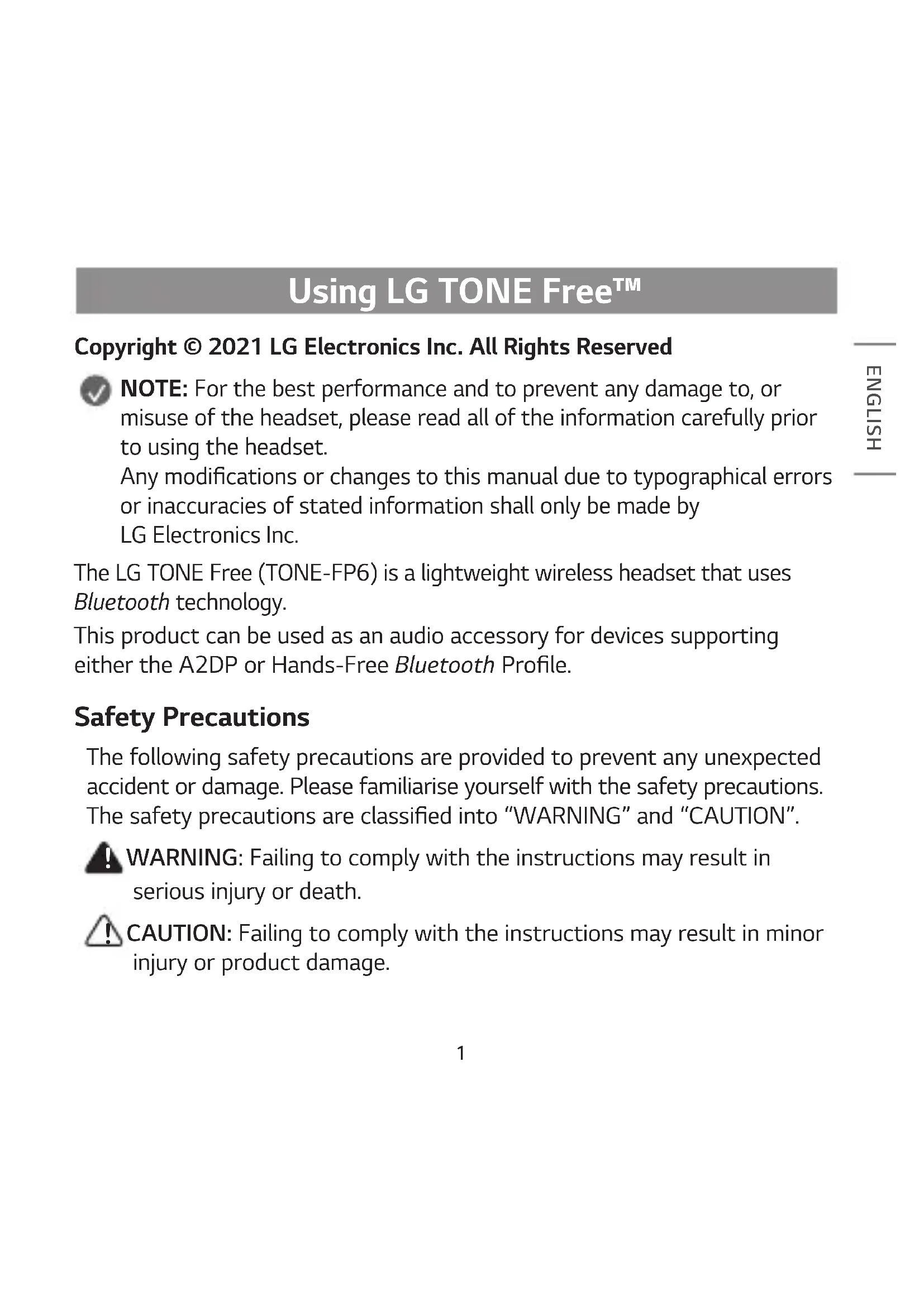 Copyright © 2021 LG Electronics Inc. All Rights Reserved NOTE: For the best performance and to prevent any damage to, or misuse of the headset, please read all of the information carefully prior to using the headset. Any modications or changes to this manual due to typographical errors or inaccuracies of stated information shall only be made by LG Electronics Inc. The LG TONE Free (TONE-FP6) is a lightweight wireless headset that uses Bluetooth technology. This product can be used as an audio accessory for devices supporting either the A2DP or Hands-Free Bluetooth Prole. Safety Precautions The following safety precautions are provided to prevent any unexpected accident or damage. Please familiarise yourself with the safety precautions. The safety precautions are classied into “WARNING” and “CAUTION”.