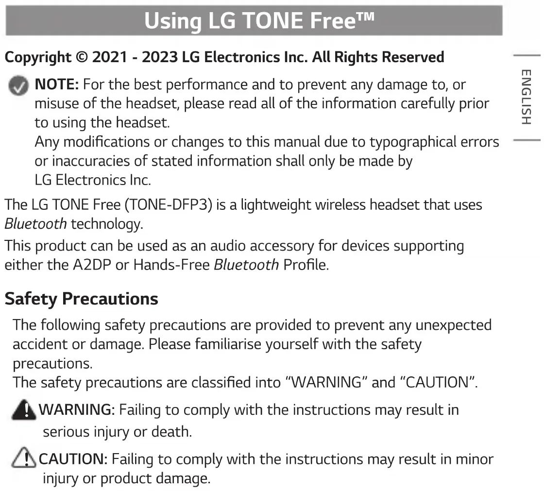 Copyright © 2021 - 2023 LG Electronics Inc. All Rights Reserved NOTE: For the best performance and to prevent any damage to, or misuse of the headset, please read all of the information carefully prior to using the headset. Any modications or changes to this manual due to typographical errors or inaccuracies of stated information shall only be made by LG Electronics Inc. The LG TONE Free (TONE-DFP3) is a lightweight wireless headset that uses Bluetooth technology. This product can be used as an audio accessory for devices supporting either the A2DP or Hands-Free Bluetooth Prole. Safety Precautions The following safety precautions are provided to prevent any unexpected accident or damage. Please familiarise yourself with the safety precautions. The safety precautions are classied into “WARNING” and “CAUTION”.