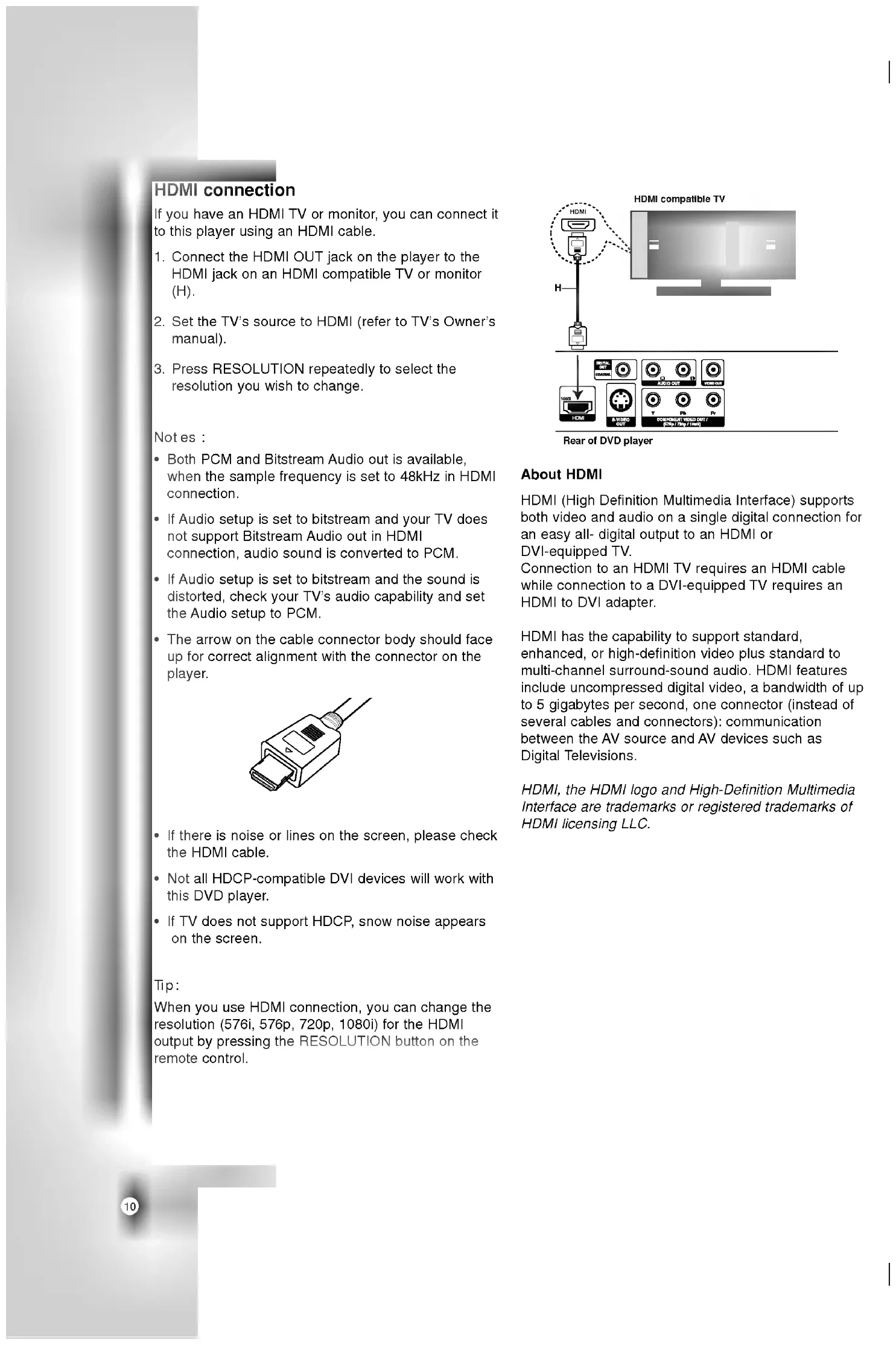 does not support HDCP, snow noise appears the screen. Tip: When you use HDMI connection, you can change the resolution (576i, 576p, 720p, 1080i) for the HDMI output