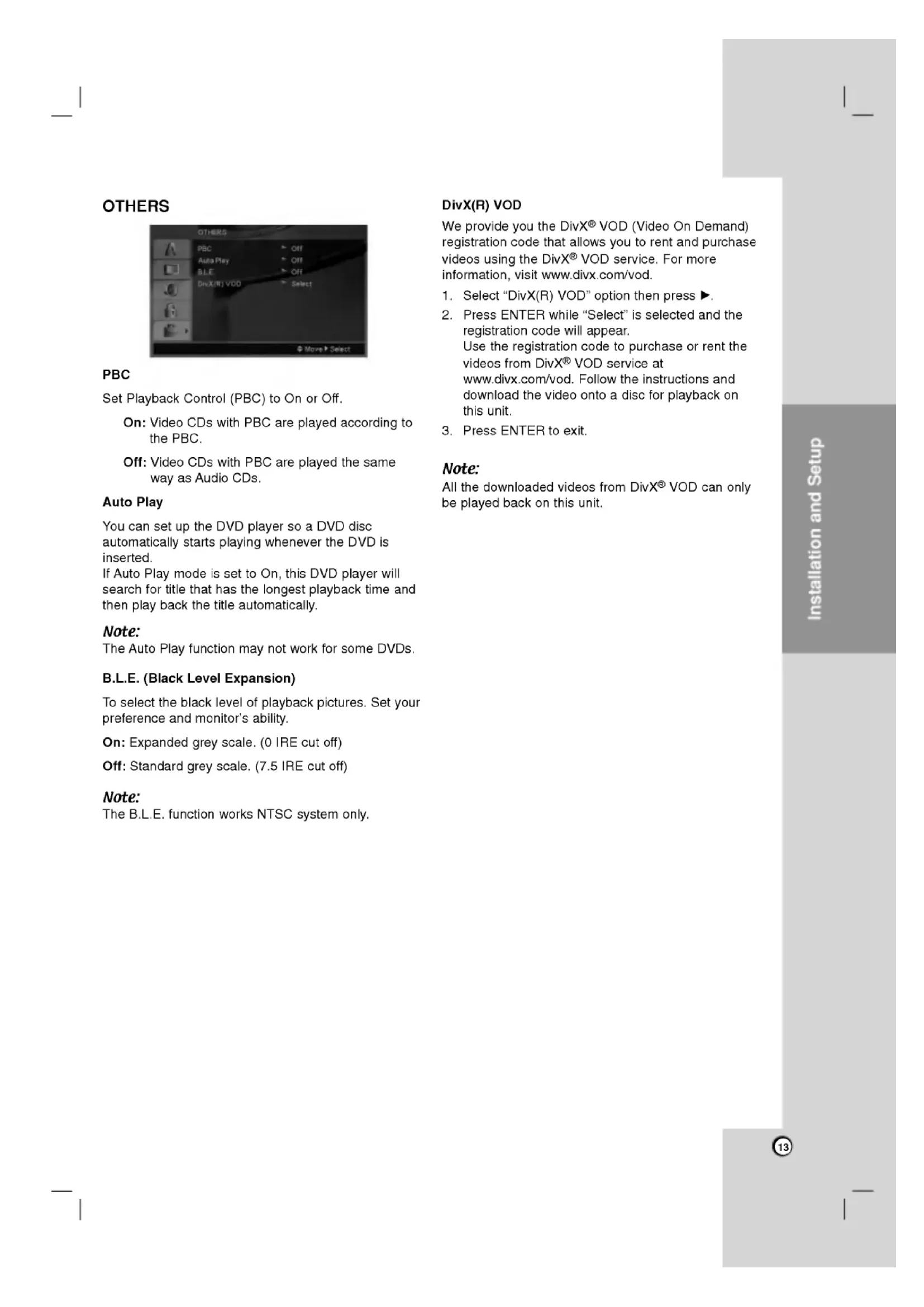 IRE cut off) Off: Standard grey scale. (7.5 IRE cut off) Note: The B.L.E. function works NTSC system only. DivX(R) VOD