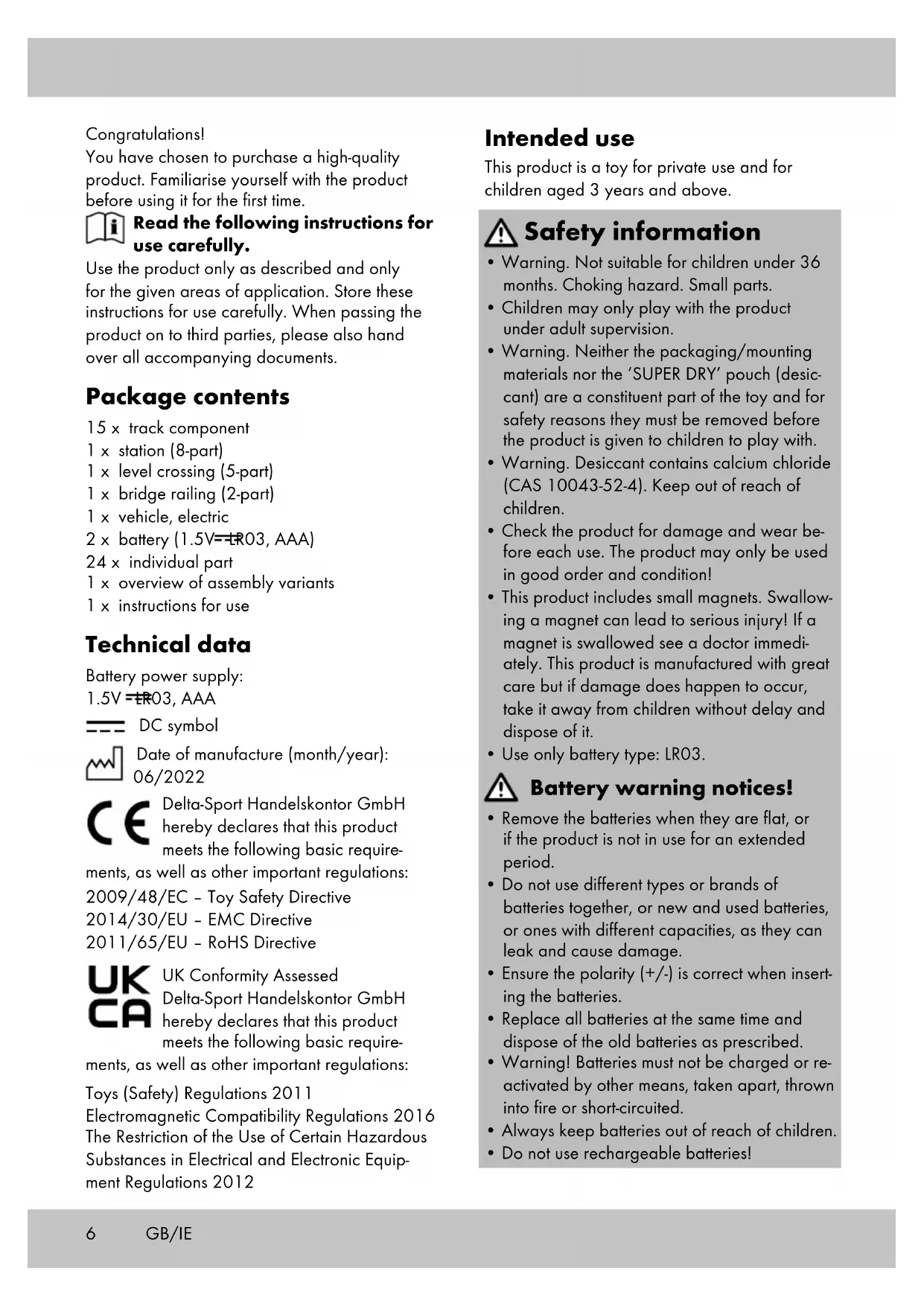DC symbol Date of manufacture (month/year): 06/2022 Delta-Sport Handelskontor GmbH hereby declares that this product meets the following basic require- ments, as well as other important regulations: 2009/48/EC – Toy Safety Directive 2014/30/EU – EMC Directive 2011/65/EU – RoHS Directive UK Conformity Assessed Delta-Sport Handelskontor GmbH hereby declares that this product meets the following basic require- ments, as well as other important regulations: Toys (Safety) Regulations 2011 Electromagnetic Compatibility Regulations 2016 The Restriction of the Use of Certain Hazardous Substances in Electrical and Electronic Equip- ment Regulations 2012 Intended use This product is a toy for private use and for children aged 3 years and above. Safety information