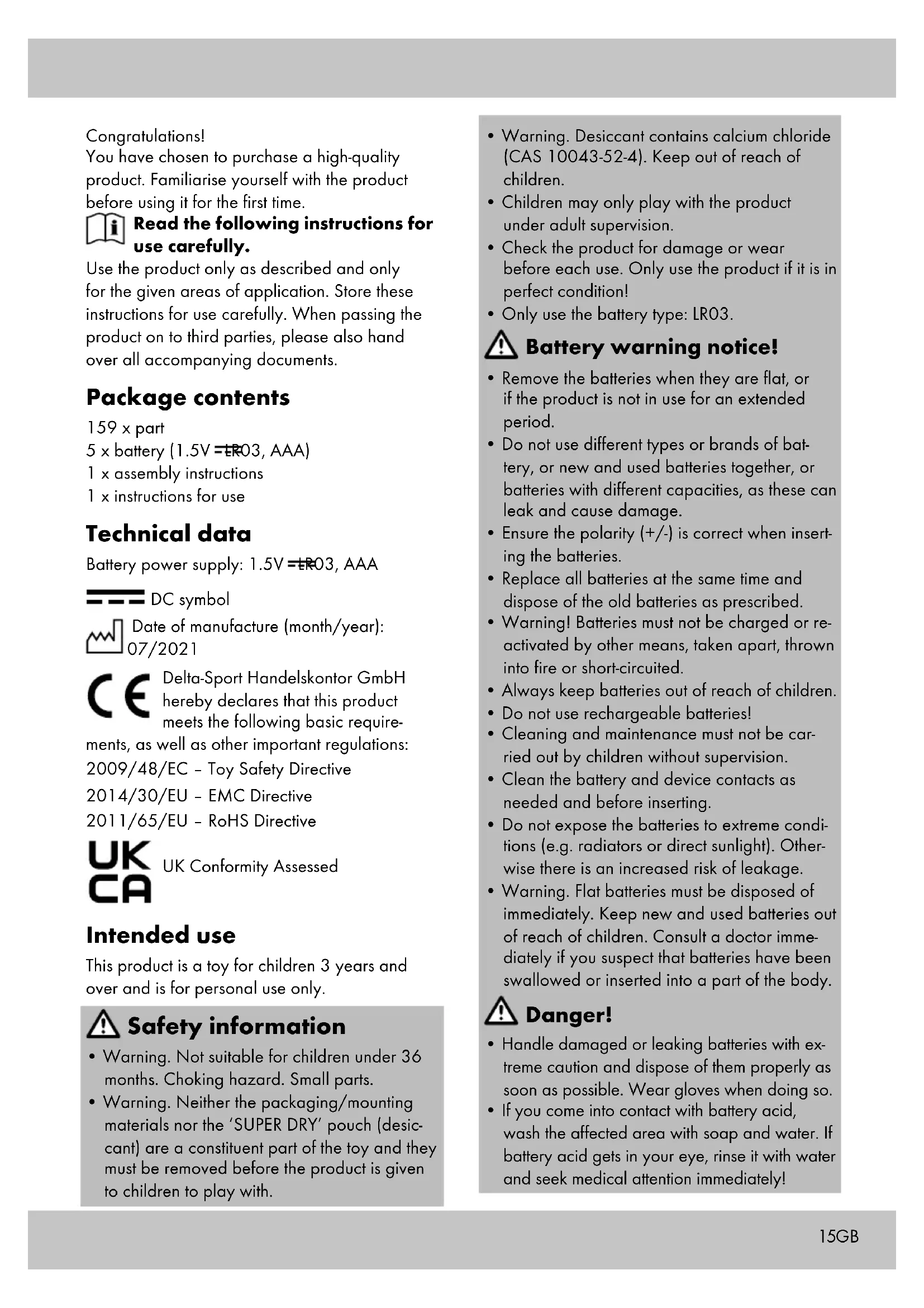 - Warning. Neither the packaging/mounting materials nor the ‘SUPER DRY’ pouch (desic- cant) are a constituent part of the toy and they must be removed before the product is given to children to play with.