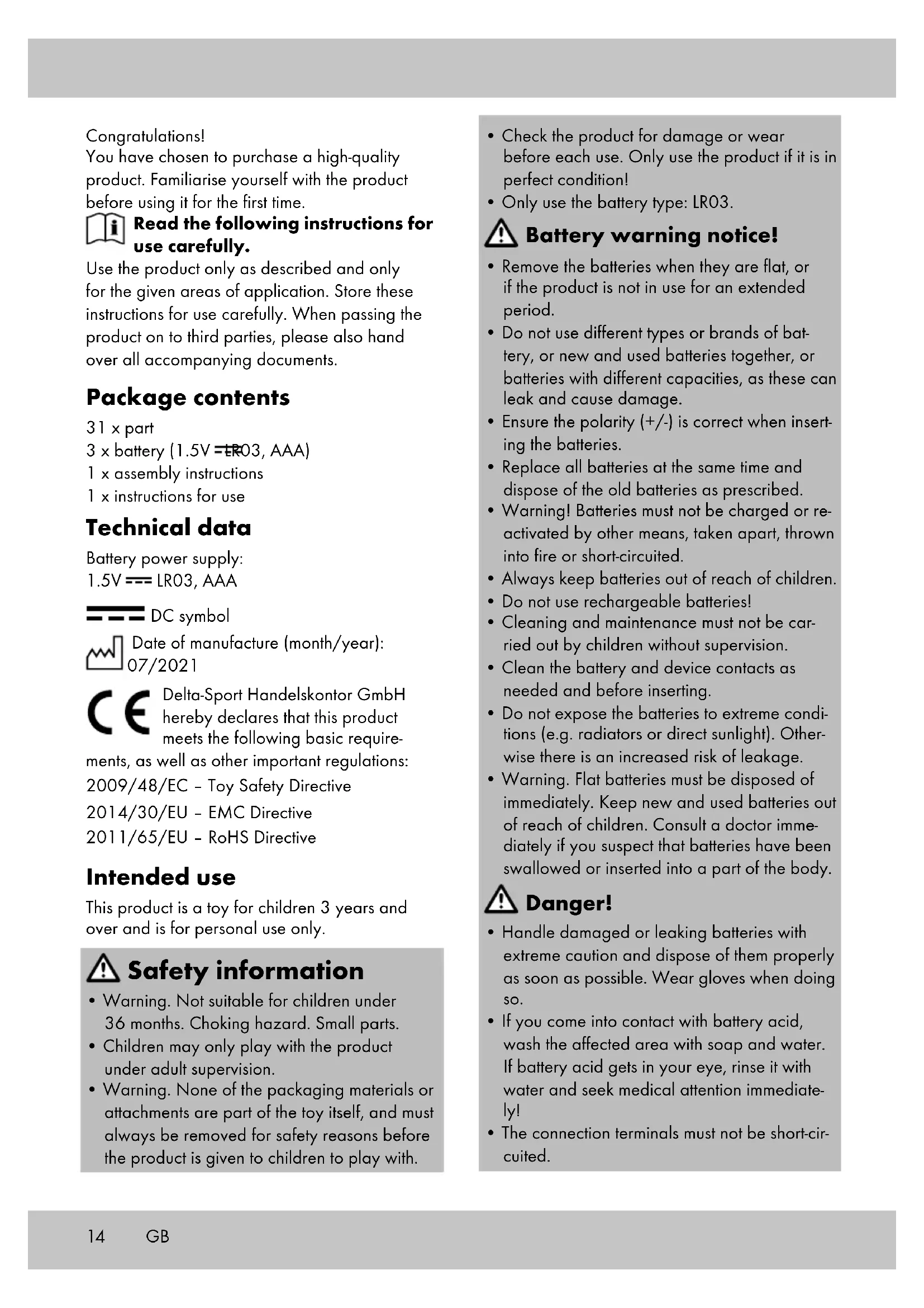 - The connection terminals must not be short-cir- cuited. Congratulations! You have chosen to purchase a high-quality product. Familiarise yourself with the product before using it for the first time. Read the following instructions for use carefully. Use the product only as described and only for the given areas of application. Store these instructions for use carefully. When passing the product on to third parties, please also hand over all accompanying documents. Package contents 31 x part 3 x battery (1.5V LR03, AAA) 1 x assembly instructions 1 x instructions for use Technical data Battery power supply: 1.5V LR03, AAA DC symbol Date of manufacture (month/year): 07/2021 Delta-Sport Handelskontor GmbH hereby declares that this product meets the following basic require- ments, as well as other important regulations: 2009/48/EC – Toy Safety Directive 2014/30/EU – EMC Directive 2011/65/EU – RoHS Directive Intended use This product is a toy for children 3 years and over and is for personal use only. Safety information