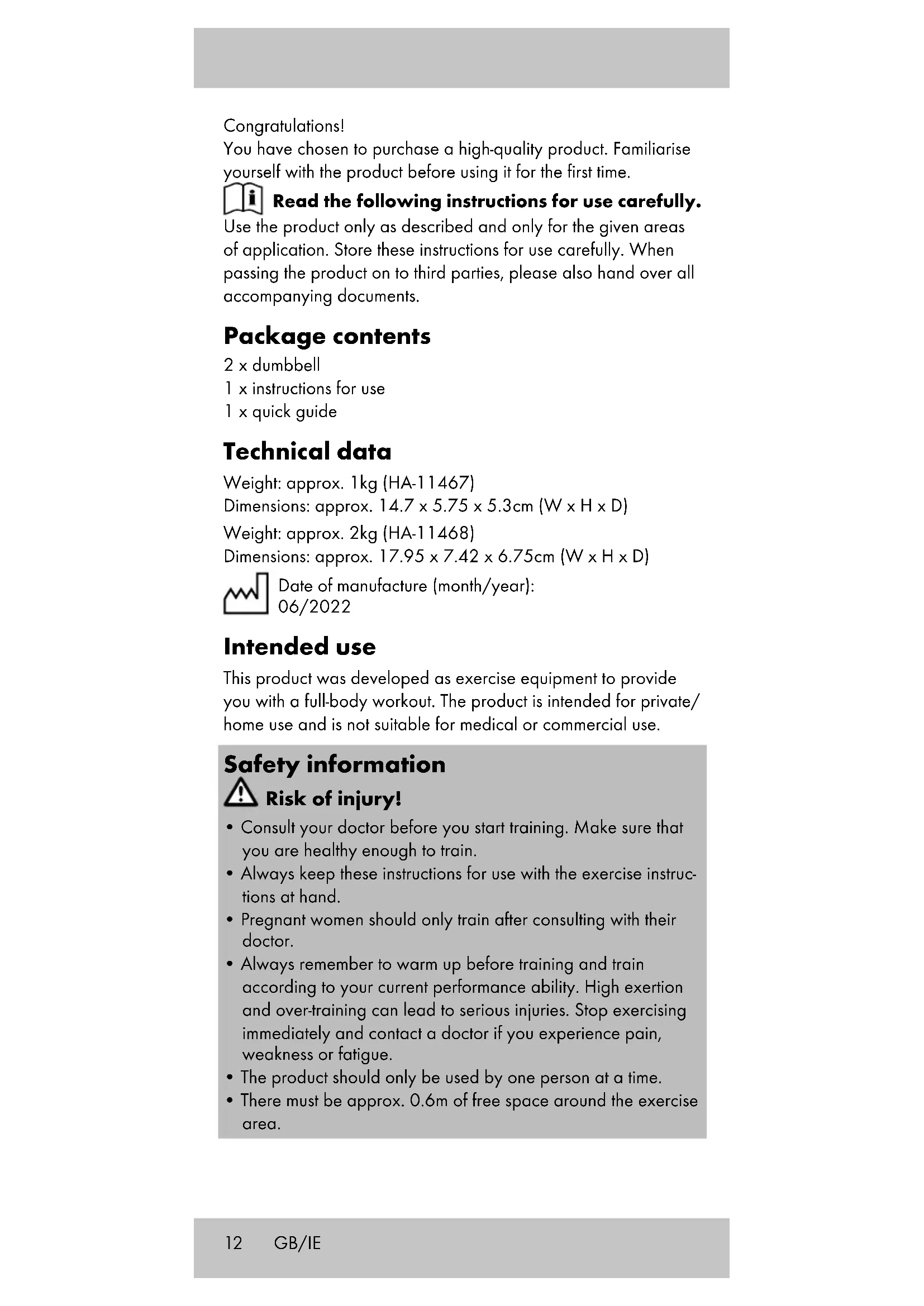 Important: make sure your thighs remain parallel to each other. Push your hips forwards, keeping your upper body upright. Storage, cleaning When not in use, always store the product clean and dry at room temperature. Only clean the product with a damp cloth and wipe dry afterwards. IMPORTANT! Never clean the product with harsh cleaning agents. Disposal Dispose of the article and the packaging materials in accord- ance with current local regulations. Packaging materials such as foil bags are not suitable to be given to children. Keep the packaging materials out of the reach of children. Dispose of the products and the packaging in an environmentally friendly manner. GB/IE15 The recycling code is used to identify various materials for recycling. The code consists of the recycling symbol – which is meant to reflect the recycling cycle – and a number which identifies the material. Notes on the guarantee and service handling The product was produced with great care and under continuous quality control. DELTA-SPORT HANDELSKONTOR GmbH gives private end customers a three-year guarantee on this product from the date of purchase (guarantee period) in accordance with the following provisions. The guarantee is only valid for material and manufacturing defects. The guarantee does not cover parts subject to normal wear and tear that are thus considered wear parts (e.g. batteries) or fragile parts such as switches, rechargea- ble batteries, or parts made of glass. Claims under this guarantee are excluded if the product has been used incorrectly, improperly, or contrary to the intended purpose, or if the provisions in the instructions for use were not observed, unless the end customer proves that a material or manufacturing defect exists that was not caused by one of the aforementioned circumstances. Claims under the guarantee can only be made within the guarantee period by presenting the original sales receipt. Please therefore keep the original sales receipt. The guarantee period is not extended by any repairs carried out under the guarantee, under statutory guarantees, or as a gesture of goodwill. This also applies to replaced and repaired parts. If you wish to make a claim please first contact the service hotline mentioned below or contact us by e-mail. If there is a guaran- tee case, then the product will be repaired or replaced free of charge to you or the purchase price will be refunded, depending on our choice. Your legal rights, in particular guarantee claims against the respective seller, are not limited by this guarantee. IAN: 391390_2201 Service Great Britain Tel.: 0800 404 7657 E-Mail: deltasport@lidl.co.uk Service Ireland Tel.: 11800 101010 E-Mail: deltasport@lidl.ie GB/IE16 Félicitations ! Vous venez d’acquérir un article de grande qualité. Avant la première utilisation, familiarisez-vous avec l’article. Pour cela, veuillez lire attentivement la notice d’utilisation suivante. Utilisez l’article uniquement comme indiqué et pour les domaines d’utilisation mentionnés. Conservez bien cette notice d’utilisation. Si vous cédez l’article à un tiers, veillez à lui remettre l’ensemble de la documentation. Étendue de la livraison 2 haltère 1 notice d’utilisation 1 guide de démarrage Caractéristiques techniques Poids : env. 1 kg (HA-11467) Dimensions : env. 14,7 x 5,75 x 5,3 cm (La x H x P) Poids : env. 2 kg (HA-11468) Dimensions : env. 17,95 x 7,42 x 6,75 cm (La x H x P) Date de fabrication (Mois/Année) : 06/2022 Utilisation conforme à sa destination Cet article a été développé comme un outil d’entraînement avec lequel vous pouvez entraîner tout votre corps. L’article est destiné à un usage privé/à domicile et ne convient pas à des fins médi- cales ou commerciales. Consignes de sécurité Risque de blessure !