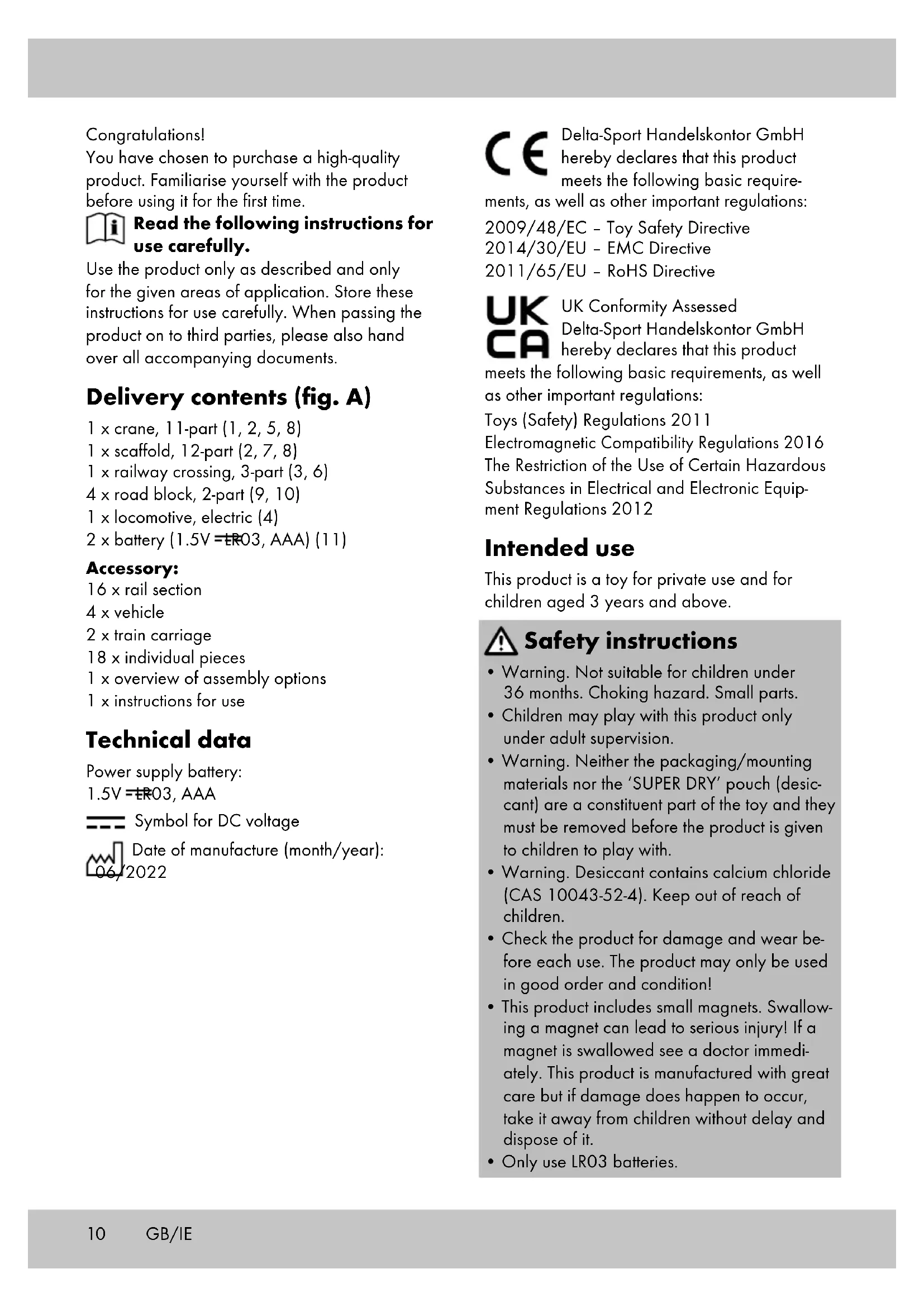 switch it off. Warning! The locomotive has not been designed to move backwards on bridges or inclines. Storage, cleaning When not in use, always store the product dry, clean, without batteries, and at room tempera- ture. Only clean the product with a damp cloth and wipe dry afterwards. Attention: the rails should be cleaned before using them for the first time! IMPORTANT! Never clean the product with harsh cleaning agents. Disposal In the interest of protecting the environ- ment, do not throw your product into the household waste once you are finished with it, but rather take it to a specialty disposal facility. Find out about collection sites and their hours of operation from your local authority. Defective or used batteries must be recycled pursuant to Directive 2006/66/EC and changes to it. Return batteries and/or the product via the collecting sites provided. Packaging materials, such as plastic bags, must be kept away from children. Keep the packaging materials out of reach of children. Environmental damage caused by improper disposal of batteries! Batteries may not be disposed of with household waste. They may contain toxic heavy metals and are subject to hazardous waste treatment. The chemical symbols of the heavy metals are as follows: Cd = cadmium, Hg = mercury, Pb = lead. Dispose of used batteries at a municipal collection site. Dispose of the product and packaging in an environmentally friendly manner. Note the label on the packaging materials when separating waste, as these are labelled with abbreviations (a) and numbers (b) with the following meaning: 1–7: plastics/20–22: paper and card- board/80–98: composite materials. The product and the packaging materials can be recycled, dispose of them separately for better treatment of waste. The Triman logo only applies to France. Find out how to dispose of the used product from your municipal or city administra- tion. Notes on the guarantee and service handling The product was produced with great care and under continuous quality control. DELTA-SPORT HANDELSKONTOR GmbH gives private end customers a three-year guarantee on this product from the date of purchase (guarantee period) in accordance with the following provisions. The guarantee is only valid for material and manufacturing defects. The guarantee does not cover parts subject to normal wear and tear that are thus considered wear parts (e.g. batteries) or fragile parts such as switches, rechargeable batteries, or parts made of glass. GB/IE13GB/IE Claims under this guarantee are excluded if the product has been used incorrectly, improperly, or contrary to the intended purpose, or if the provisions in the instructions for use were not observed, unless the end customer proves that a material or manufacturing defect exists that was not caused by one of the aforementioned circumstances. Claims under the guarantee can only be made within the guarantee period by presenting the original sales receipt. Please therefore keep the original sales receipt. The guarantee period is not extended by any repairs carried out under the guarantee, under statutory guarantees, or as a gesture of goodwill. This also applies to replaced and repaired parts. If you wish to make a claim please first contact the service hotline mentioned below or contact us by e-mail. If there is a guarantee case, then the product will be repaired or replaced free of charge to you or the purchase price will be refunded, depending on our choice. Your legal rights, in particular guarantee claims against the respective seller, are not limited by this guarantee. IAN: 391017_2201 Service Great Britain Tel.: 0800 404 7657 E-Mail: deltasport@lidl.co.uk Service Ireland Tel.: 1800 101010 E-Mail: deltasport@lidl.ie14 Félicitations ! Vous venez d’acquérir un article de grande qualité. Avant la première utilisation, familiari- sez-vous avec l’article. Pour cela, veuillez lire attentive- ment la notice d’utilisation suivante. Utilisez l’article uniquement comme indiqué et pour les domaines d’utilisation mentionnés. Conservez bien cette notice d’utilisation. Si vous cédez l’article à un tiers, veillez à lui remettre l’ensemble de la documentation. Éléments livrés (fig. A) 1 grue, 11 pièces (1, 2, 5, 8) 1 échafaudage, 12 pièces (2, 7, 8) 1 passage à niveau, 3 pièces (3, 6) 4 barrage routier, 2 pièces (9, 10) 1 locomotive électrique (4) 2 pile (1,5V LR03, AAA) (11) Accessoire: 16 tronçon de rail 4 véhicule 2 remorque 18 éléments 1 aperçu des variantes de montage 1 notice d’utilisation Données techniques Alimentation pile : 1,5V LR03, AAA Symbole de tension continue Date de fabrication (Mois/Année) : 06/2022 Delta-Sport Handelskontor GmbH déclare par la présente que cet article répond aux exigences essentielles et aux autres dispositions en vigueur suivantes : 2009/48/CE – Directive relative à la sécurité des jouets 2014/30/UE – Directive européenne CEM 2011/65/UE – Directive RoHS Utilisation conforme Cet article est un jouet pour les enfants à partir de 3 ans destiné à un usage privé. Consignes de sécurité
