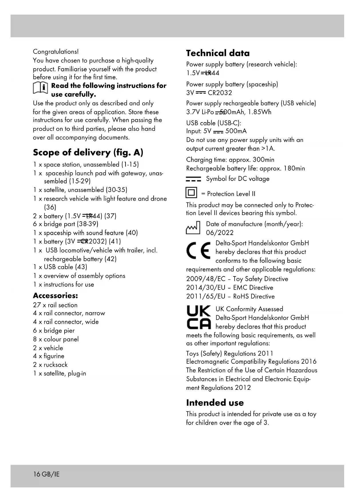 first use! IMPORTANT! Never clean the product with harsh cleaning agents. Disposal The accompanying symbol indicates that this device complies with Directive 2012/19/EU. This directive indicates that you may not dispose of this device along with basic household waste at the end of its useful life and instead must hand it in to specifically designated collection sites, valuable substance collection stations, or waste disposal facilities. Look after the environment and dispose of waste properly. Batteries may not be disposed of with household waste. They may contain toxic heavy metals and are subject to hazardous waste treatment. The chemical symbols of the heavy metals are as fol- lows: Cd = cadmium, Hg = mercury, Pb = lead. Dispose of used batteries at a municipal collec- tion site. For further information about disposal of the product no longer needed, contact your local council. Dispose of the product and the packaging in an environmentally friendly manner. Store the packaging materials (foil bags, for example) out of the reach of children. Note the label on the packaging materials when separating waste, as these are labelled with abbreviations (a) and numbers (b) with the following meaning: 1–7: plastics / 20–22: paper and cardboard / 80–98: composite materials. The product and the packaging materials can be recycled, dispose of them separately for better treatment of waste. The Triman logo only applies to France. Notes on the guarantee and service handling The product was produced with great care and under continuous quality control. DELTA-SPORT HANDELSKONTOR GmbH gives private end customers a three-year guarantee on this product from the date of purchase (guarantee period) in accordance with the following provisions. The guarantee is only valid for material and manufacturing defects. The guarantee does not cover parts subject to normal wear and tear that are thus considered wear parts (e.g. batteries) or fragile parts such as switches, rechargeable batteries, or parts made of glass. GB/IE21GB/IE Claims under this guarantee are excluded if the product has been used incorrectly, improperly, or contrary to the intended purpose, or if the provisions in the instructions for use were not observed, unless the end customer proves that a material or manufacturing defect exists that was not caused by one of the aforementioned circumstances. Claims under the guarantee can only be made within the guarantee period by presenting the original sales receipt. Please therefore keep the original sales receipt. The guarantee period is not extended by any repairs carried out under the guarantee, under statutory guarantees, or as a gesture of goodwill. This also applies to replaced and repaired parts. If you wish to make a claim please first contact the service hotline mentioned below or contact us by e-mail. If there is a guarantee case, then the product will be repaired or replaced free of charge to you or the purchase price will be refunded, depending on our choice. Your legal rights, in particular guarantee claims against the respective seller, are not limited by this guarantee. IAN: 391021_2201 Service Great Britain Tel.: 0800 404 7657 E-Mail: deltasport@lidl.co.uk Service Ireland Tel.: 1800 101010 E-Mail: deltasport@lidl.ie22 FR/BE Félicitations ! Vous venez d’acquérir un article de grande qualité. Avant la première utilisation, familiari- sez-vous avec l’article. Pour cela, veuillez lire attentive- ment la notice d’utilisation suivante. Utilisez l’article uniquement comme indiqué et pour les domaines d’utilisation mentionnés. Conservez bien cette notice d’utilisation. Si vous cédez l’article à un tiers, veillez à lui remettre l’ensemble de la documentation. Contenu de la livraison (fig. A) 1 x station spatiale, démontée (1-15) 1 x plate-forme de lancement de vaisseaux spa- tiaux avec passerelle, démontée (15-29) 1 x satellite, démonté (30-35) 1 x véhicule d’investigation avec fonction lumi- neuse et drone (36) 2 x pile (1,5V LR44) (37) 6 x élément de pont (38-39) 1 x vaisseau spatial avec fonction sonore (40) 1 x pile (3V CR2032) (41) 1 x véhicule USB avec remorque, batterie incluse (42) 1 x câble USB (43) 1 x aperçu des variantes de montage 1 x notice d’utilisation Accessoires : 27 x élément de rail 4 x raccord de rail, étroit 4 x raccord de rail, large 6 x base de pont 8 x plaquette de couleur 2 x véhicule 4 x figurine 2 x sac à dos 1 x satellite, enfichable Données techniques Alimentation pile (véhicule d’investigation) : 1,5V LR44 Alimentation pile (vaisseau spatial) :