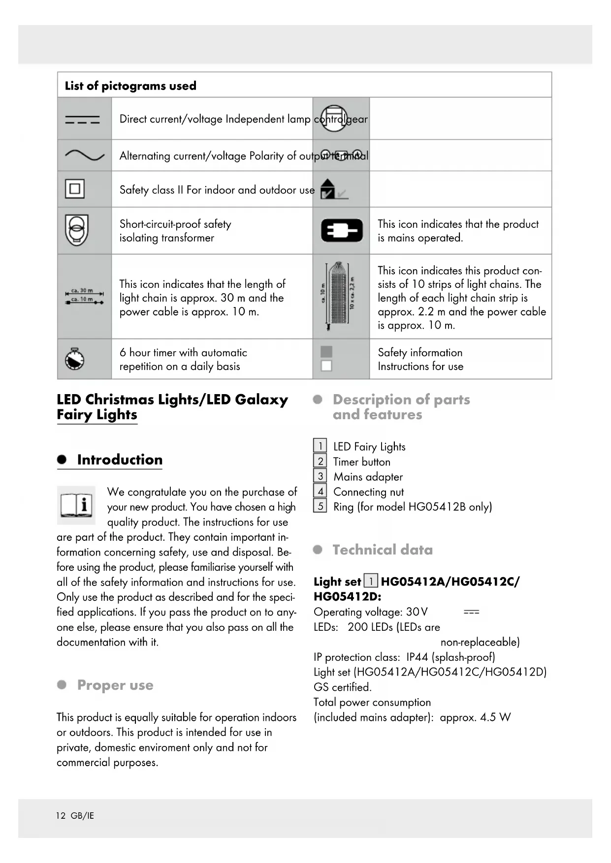 HG05412A/HG05412C/ HG05412D: Operating voltage: 30 V LEDs: 200 LEDs (LEDs are non-replaceable) IP protection class: IP44 (splash-proof) Light set (HG05412A/HG05412C/HG05412D) GS certified. Total power consumption (included mains adapter): approx. 4.5 W13 GB/IE HG05412B: Operating voltage: 30 V LEDs: 180 LEDs (LEDs are non- replaceable) IP protection class: IP44 (splash-proof) Light set (Model No. HG05412B) GS certified. Total power consumption (included mains adapter): approx. 4.5 W Mains adapter
