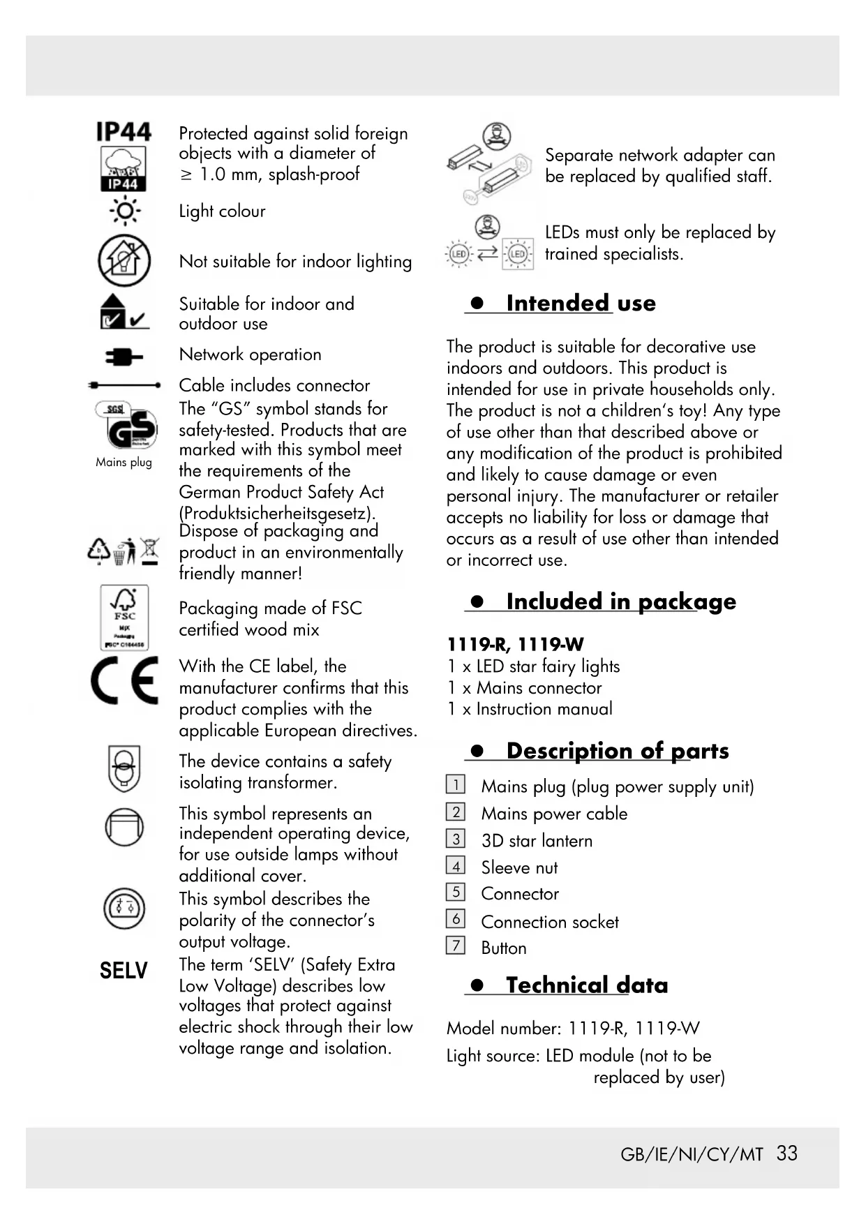 WARNING! Follow the full operating instructions and safety instructions in order to prevent personal injury and damage to property. This quick start guide is an essential part of the product. Familiarise yourself with all operating and safety instructions before using the product. Keep the quick start guide in a safe place and pass on all documentation to third parties if you pass on the product. z Explanation of symbols Read the operating instructions! Issue date of instruction manual (month/year) Date of manufacture (month/year) Alternating current Direct current Risk of fatal injury and accidents for infants and children! Observe warning notices and safety instructions! Warning! Risk of electric shock! Electrical devices that carry this symbol are rated as Protection Class II.33 GB/IE/NI/CY/MT Protected against solid foreign objects with a diameter of ≥ 1.0 mm, splash-proof Light colour Not suitable for indoor lighting Suitable for indoor and outdoor use Network operation Cable includes connector Mains plug The “GS” symbol stands for safety-tested. Products that are marked with this symbol meet the requirements of the German Product Safety Act (Produktsicherheitsgesetz). Dispose of packaging and product in an environmentally friendly manner! Packaging made of FSC certied wood mix With the CE label, the manufacturer conrms that this product complies with the applicable European directives. The device contains a safety isolating transformer. This symbol represents an independent operating device, for use outside lamps without additional cover. This symbol describes the polarity of the connector’s output voltage. SELV The term ‘SELV’ (Safety Extra Low Voltage) describes low voltages that protect against electric shock through their low voltage range and isolation. Separate network adapter can be replaced by qualied staff. LEDs must only be replaced by trained specialists. z Intended use The product is suitable for decorative use indoors and outdoors. This product is intended for use in private households only. The product is not a children‘s toy! Any type of use other than that described above or any modication of the product is prohibited and likely to cause damage or even personal injury. The manufacturer or retailer accepts no liability for loss or damage that occurs as a result of use other than intended or incorrect use. z Included in package 1119-R, 1119-W 1 x LED star fairy lights 1 x Mains connector 1 x Instruction manual z Description of parts