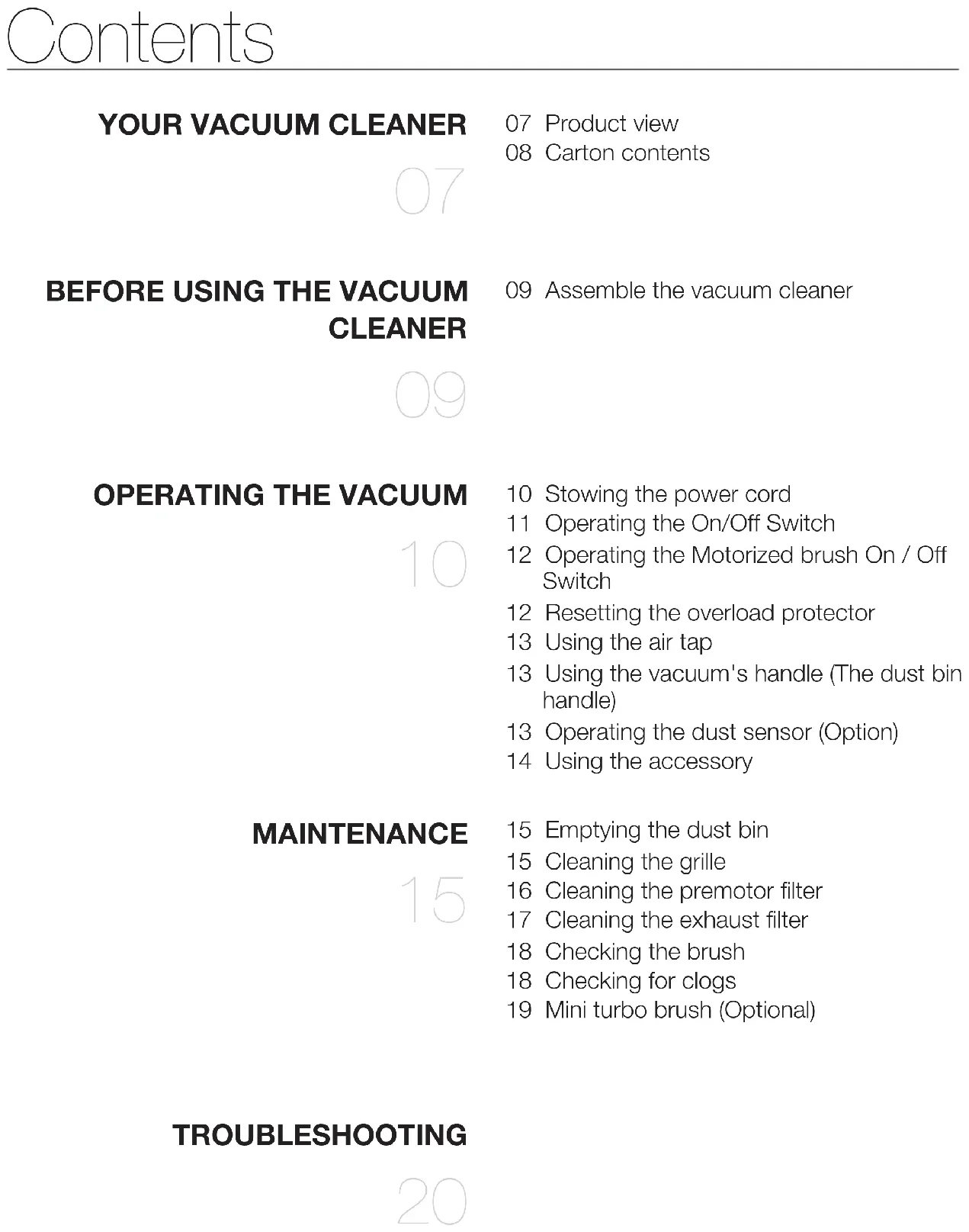 10 Stowing the power cord 11 Operating the On/Off Switch 12 Operating the Motorized brush On / Off Switch 12 Resetting the overload protector 13 Using the air tap 13 Using the vacuum's handle (The dust bin handle) 13 Operating the dust sensor (Option) 14 Using the accessory MAINTENANCE
