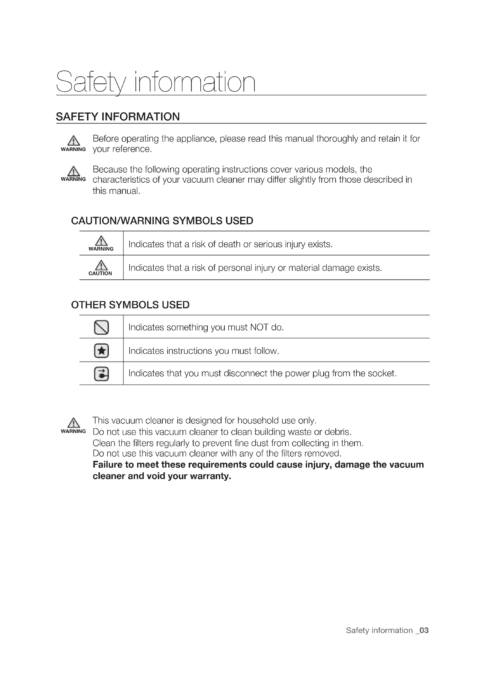 Indicates something you must NOT do. Indicates instructions you must follow. Indicates that you must disconnect the power plug from the socket. WARNING This vacuum cleaner is designed for household use only. Do not use this vacuum cleaner to clean building waste or debris. Clean the filters regularly to prevent fine dust from collecting in them. Do not use this vacuum cleaner with any of the filters removed. Failure to meet these requirements could cause injury, damage the vacuum cleaner and void your warranty.04_ Safety information