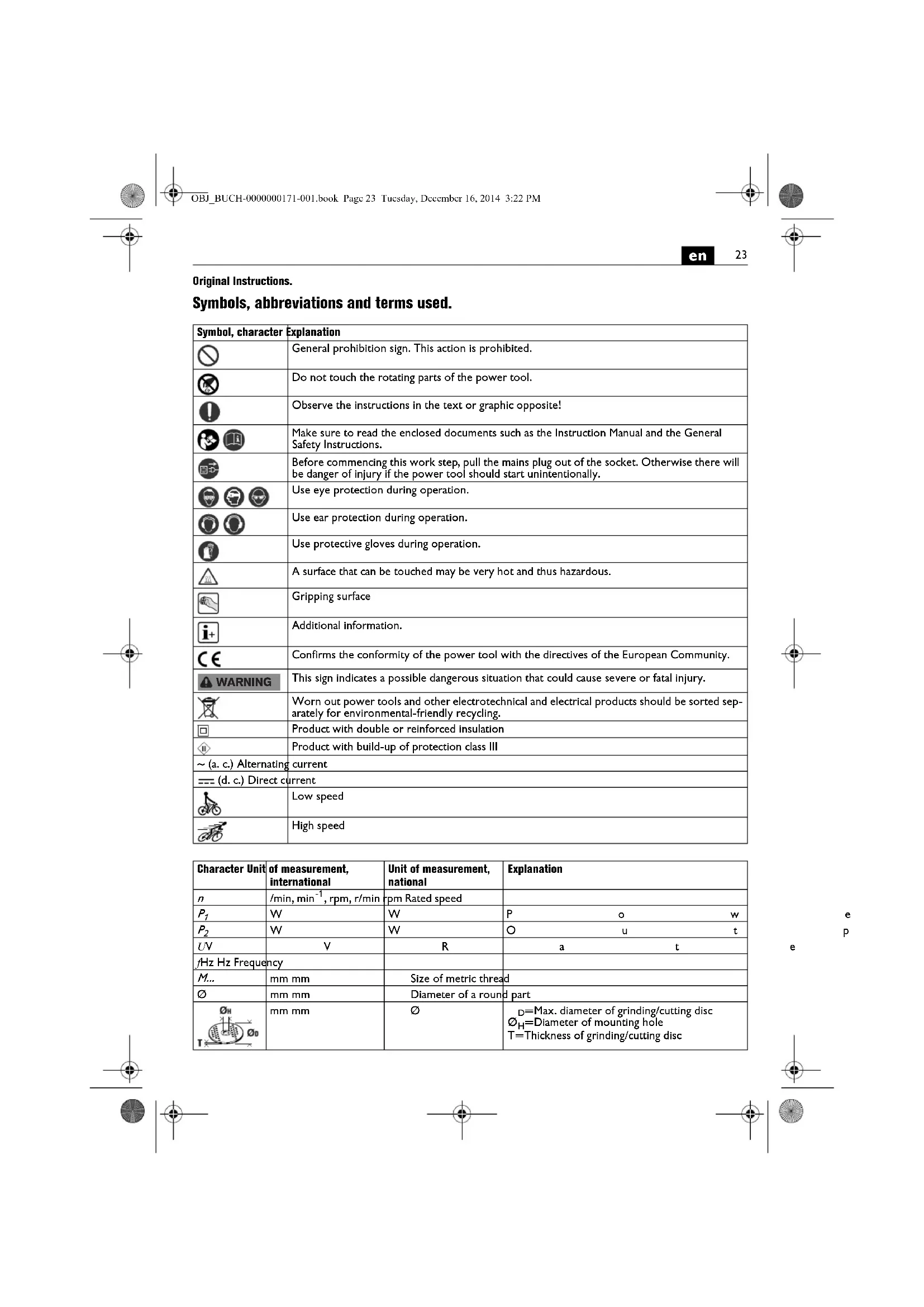 Original Instructions. Symbols, abbreviations and terms used. Symbol, character Explanation General prohibition sign. This action is prohibited. Do not touch the rotating parts of the power tool. Observe the instructions in the text or graphic opposite! Make sure to read the enclosed documents such as the Instruction Manual and the General Safety Instructions. Before commencing this work step, pull the mains plug out of the socket. Otherwise there will be danger of injury if the power tool should start unintentionally. Use eye protection during operation. Use ear protection during operation. Use protective gloves during operation. A surface that can be touched may be very hot and thus hazardous. Gripping surface Additional information. Confirms the conformity of the power tool with the directives of the European Community. This sign indicates a possible dangerous situation that could cause severe or fatal injury. Worn out power tools and other electrotechnical and electrical products should be sorted sep- arately for environmental-friendly recycling. Product with double or reinforced insulation Product with build-up of protection class III ~ (a. c.) Alternating current (d. c.) Direct current Low speed High speed WARNING Character Unit of measurement, international Unit of measurement, national Explanation
