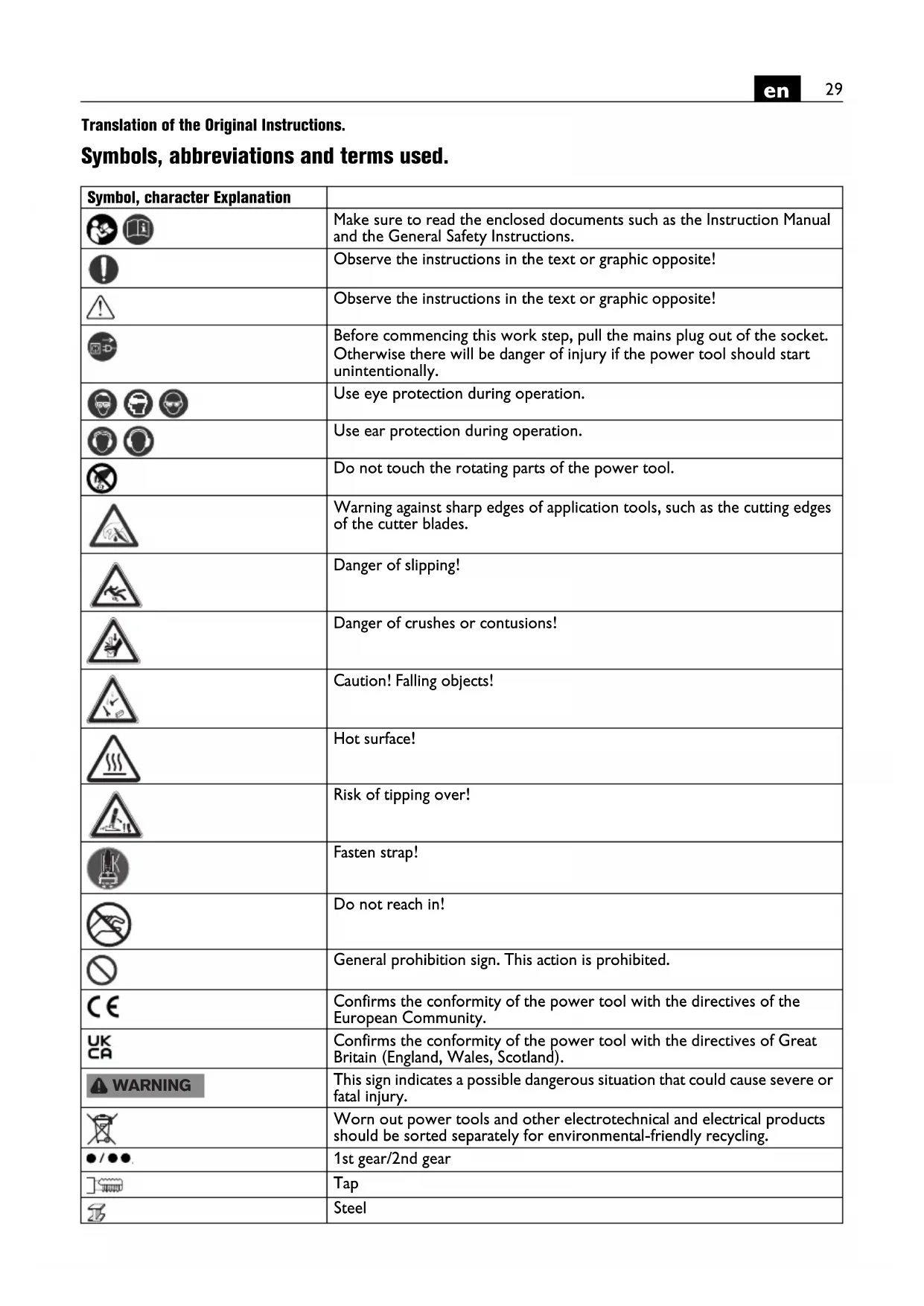 Translation of the Original Instructions. Symbols, abbreviations and terms used. Symbol, character Explanation Make sure to read the enclosed documents such as the Instruction Manual and the General Safety Instructions. Observe the instructions in the text or graphic opposite! Observe the instructions in the text or graphic opposite! Before commencing this work step, pull the mains plug out of the socket. Otherwise there will be danger of injury if the power tool should start unintentionally. Use eye protection during operation. Use ear protection during operation. Do not touch the rotating parts of the power tool. Warning against sharp edges of application tools, such as the cutting edges of the cutter blades. Danger of slipping! Danger of crushes or contusions! Caution! Falling objects! Hot surface! Risk of tipping over! Fasten strap! Do not reach in! General prohibition sign. This action is prohibited. Confirms the conformity of the power tool with the directives of the European Community. Confirms the conformity of the power tool with the directives of Great Britain (England, Wales, Scotland). This sign indicates a possible dangerous situation that could cause severe or fatal injury. Worn out power tools and other electrotechnical and electrical products should be sorted separately for environmental-friendly recycling. 1st gear/2nd gear Tap Steel WARNING30