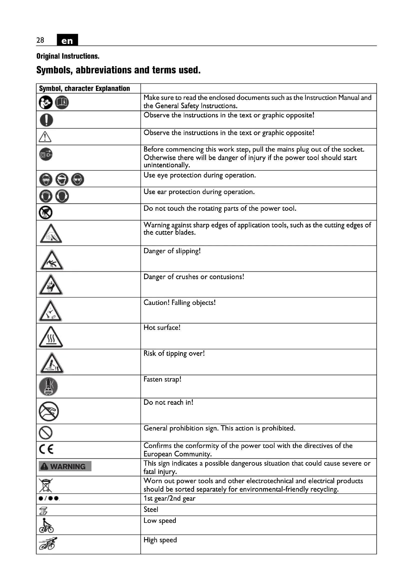 Original Instructions. Symbols, abbreviations and terms used. Symbol, character Explanation Make sure to read the enclosed documents such as the Instruction Manual and the General Safety Instructions. Observe the instructions in the text or graphic opposite! Observe the instructions in the text or graphic opposite! Before commencing this work step, pull the mains plug out of the socket. Otherwise there will be danger of injury if the power tool should start unintentionally. Use eye protection during operation. Use ear protection during operation. Do not touch the rotating parts of the power tool. Warning against sharp edges of application tools, such as the cutting edges of the cutter blades. Danger of slipping! Danger of crushes or contusions! Caution! Falling objects! Hot surface! Risk of tipping over! Fasten strap! Do not reach in! General prohibition sign. This action is prohibited. Confirms the conformity of the power tool with the directives of the European Community. This sign indicates a possible dangerous situation that could cause severe or fatal injury. Worn out power tools and other electrotechnical and electrical products should be sorted separately for environmental-friendly recycling. 1st gear/2nd gear Steel Low speed High speed WARNING29