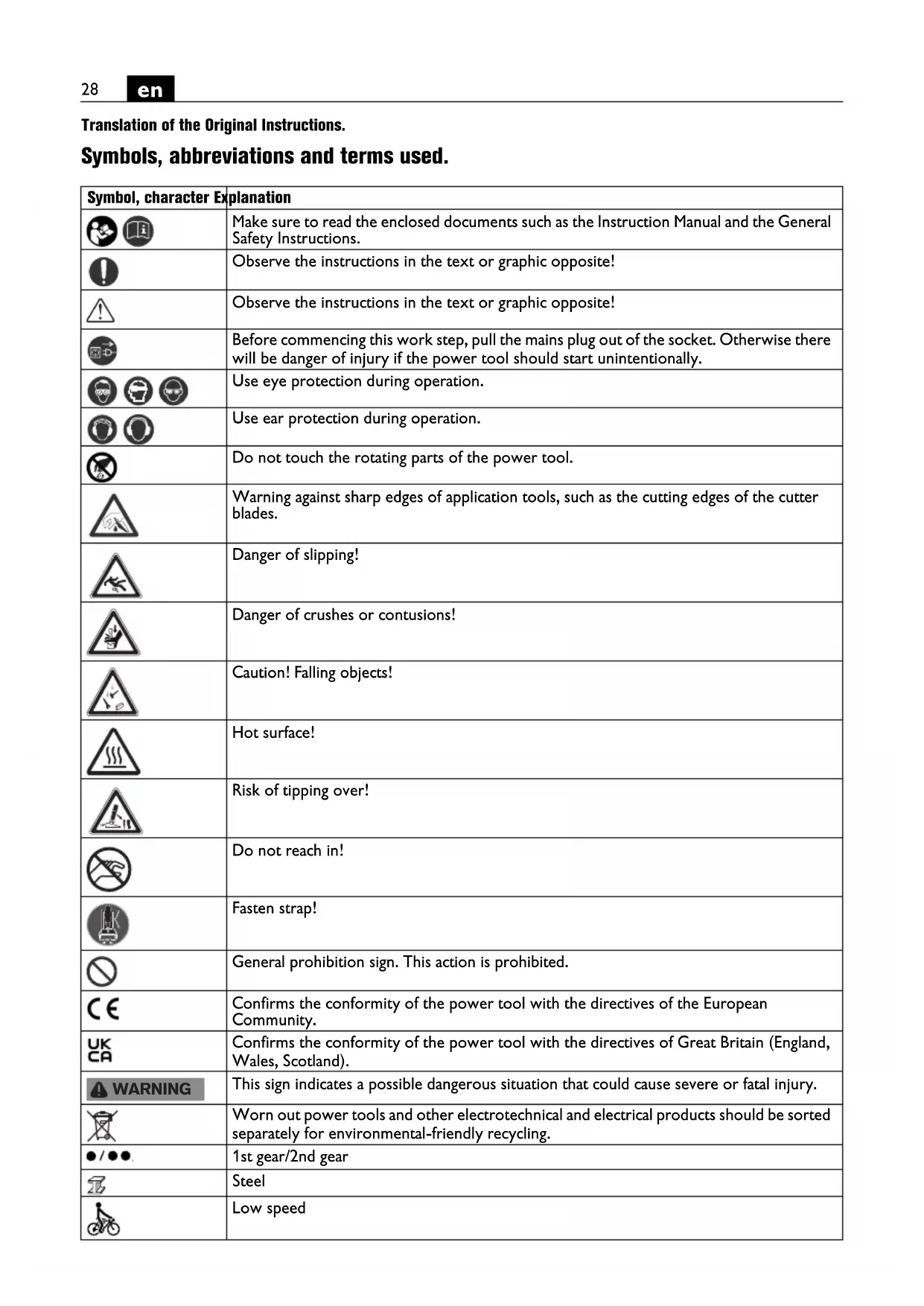 Translation of the Original Instructions. Symbols, abbreviations and terms used. Symbol, character Explanation Make sure to read the enclosed documents such as the Instruction Manual and the General Safety Instructions. Observe the instructions in the text or graphic opposite! Observe the instructions in the text or graphic opposite! Before commencing this work step, pull the mains plug out of the socket. Otherwise there will be danger of injury if the power tool should start unintentionally. Use eye protection during operation. Use ear protection during operation. Do not touch the rotating parts of the power tool. Warning against sharp edges of application tools, such as the cutting edges of the cutter blades. Danger of slipping! Danger of crushes or contusions! Caution! Falling objects! Hot surface! Risk of tipping over! Do not reach in! Fasten strap! General prohibition sign. This action is prohibited. Confirms the conformity of the power tool with the directives of the European Community. Confirms the conformity of the power tool with the directives of Great Britain (England, Wales, Scotland). This sign indicates a possible dangerous situation that could cause severe or fatal injury. Worn out power tools and other electrotechnical and electrical products should be sorted separately for environmental-friendly recycling. 1st gear/2nd gear Steel Low speed WARNING29