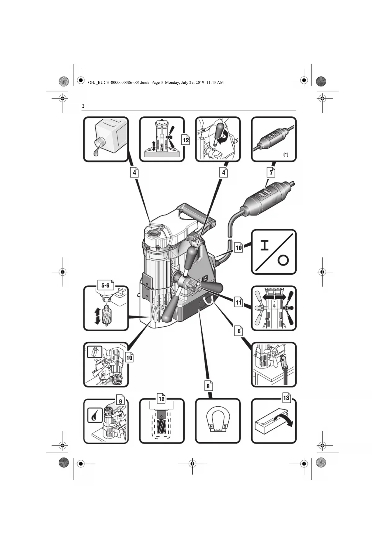 To avoid injuries, check the core drill bits prior to start- ing the work. Use only undamaged core drill bits that are not deformed. Damaged or deformed core drill bits can cause serious injury. Before putting into operation: Mount the contact pro- tector to the machine. Always secure the machine with the supplied safety strap. Especially on inclined or uneven surfaces there is risk of unsecured machines tip- ping over. When working overhead, beware of falling objects, such as cores or chips. When working overhead or on vertical surfaces, the coolant container must not be used. Use a coolant spray instead. Liquids penetrating your electric power tool may cause electric shock. Avoid touching the drilled core that is automatically ejected by the centering pin when the working proce- dure is finished. Contact with the core when it is hot, or if it falls, can cause personal injuries. Operate the power tool only from grounded sockets that comply with the specifications. Do not use any connec- tion cables that are damaged; use extension cables with a grounding contact that are checked at regular intervals. A ground conductor without continuity can cause an electric shock. To prevent injuries, always keep your hands, clothing, etc. away from rotating swarf. The swarf can cause inju- ries. Always use the swarf protector. Do not attempt to remove the cutting tool if it still turns. This can lead to serious injuries. Beware of any concealed electric cables, gas or water conduits. Check the working area before commencing work, e. g. with a metal detector. Do not work materials containing magnesium. Danger of fire. Do not work CFP (carbon-fiber-reinforced polymer) and materials containing asbestos. These materials are con- sidered carcinogenic. Do not rivet or screw any name-plates or signs onto the power tool. If the insulation is damaged, protection against an electric shock will be ineffective. Adhesive labels are recommended. Do not overload the power tool or the storage case and do not use it as a ladder or stand. Overloading or stand- ing on the power tool or the storage case can lead to the upward shifting of the centre of gravity of the power tool or the storage case, and its tipping over. Do not use accessories which are not specifically designed and recommended by the power tool manu- facturer. Safe operation is not ensured merely because an accessory fits your power tool. Clean the ventilation openings on the power tool at reg- ular intervals using non-metal tools. The blower of the motor draws dust into the housing. An excessive accu- mulation of metallic dust can cause an electrical hazard. Before storage: Remove the application tool. Store the power tool only in the case or packaging. Before putting into operation, check the mains connec- tion and the mains plug for damage. Always operate the power tool with together with a PRCD personal protection switch (*). Before beginning to work, always check the proper functioning of the PRCD personal protection switch (*) (see page 24). Hand/arm vibrations The vibration emission level given in this information sheet has been measured in accordance with a stand- ardised test given in EN 62841 and may be used to compare one tool with another. It may be used for a preliminary assessment of exposure. The declared vibration emission level represents the main applications of the tool. However, if the tool is used for different applications, with different accesso- ries or poorly maintained, the vibration emission may differ. This may significantly increase the exposure level over the total working period. An estimation of the level of exposure to vibration should also take into account the times when the tool is switched off or when it is running but not actually doing the job. This may significantly reduce the expo- sure level over the total working period. Identify additional safety measures to protect the oper- ator from the effects of vibration such as: maintain the tool and the accessories, keep the hands warm, organi- sation of work patterns. Operating Instructions. Only use water-soluble cutting fluids (oil in water) as the cooling agent. Observe the manufacturer’s instructions on coolant. Pay attention that the set-up surface for the magnetic foot is flat, clean, rust-free and ice-free. Remove var- nish, putty/filler layers and other materials. Prevent an air gap between the magnetic foot and the set-up sur- face. The air gap reduces the magnetic holding power. Do not operate this machine on hot surfaces; it could lead to a permanent reduction of the magnetic holding power. When working, always use the magnetic foot; pay attention that the magnetic holding power is sufficient. When working non-magnetic materials, suitable FEIN fastening devices, such as vacuum plates or pipe drilling devices, which are available as accessories, must be used. Observe the corresponding operating instruc- tions for these. When working on steel materials with a material thick- ness of less than 12 mm, the workpiece must be rein- forced with an additional steel plate in order to guarantee the magnetic holding power. Work only with the absolutely required amount of feed. Excessive feed can lead to breakage of the appli- cation tool and loss of the magnetic holding power. When the power supply is disconnected while the motor is running, a protective circuit prevents auto- matic restarting of the motor. Restart the motor again. Do not stop the drill motor during the drilling proce- dure. OBJ_BUCH-0000000386-001.book Page 23 Monday, July 29, 2019 11:43 AM24