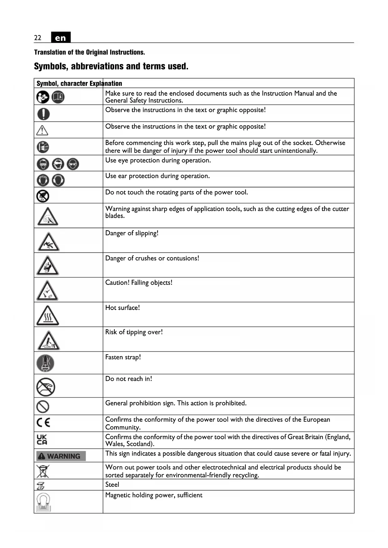 Translation of the Original Instructions. Symbols, abbreviations and terms used. Symbol, character Explanation Make sure to read the enclosed documents such as the Instruction Manual and the General Safety Instructions. Observe the instructions in the text or graphic opposite! Observe the instructions in the text or graphic opposite! Before commencing this work step, pull the mains plug out of the socket. Otherwise there will be danger of injury if the power tool should start unintentionally. Use eye protection during operation. Use ear protection during operation. Do not touch the rotating parts of the power tool. Warning against sharp edges of application tools, such as the cutting edges of the cutter blades. Danger of slipping! Danger of crushes or contusions! Caution! Falling objects! Hot surface! Risk of tipping over! Fasten strap! Do not reach in! General prohibition sign. This action is prohibited. Confirms the conformity of the power tool with the directives of the European Community. Confirms the conformity of the power tool with the directives of Great Britain (England, Wales, Scotland). This sign indicates a possible dangerous situation that could cause severe or fatal injury. Worn out power tools and other electrotechnical and electrical products should be sorted separately for environmental-friendly recycling. Steel Magnetic holding power, sufficient WARNING23