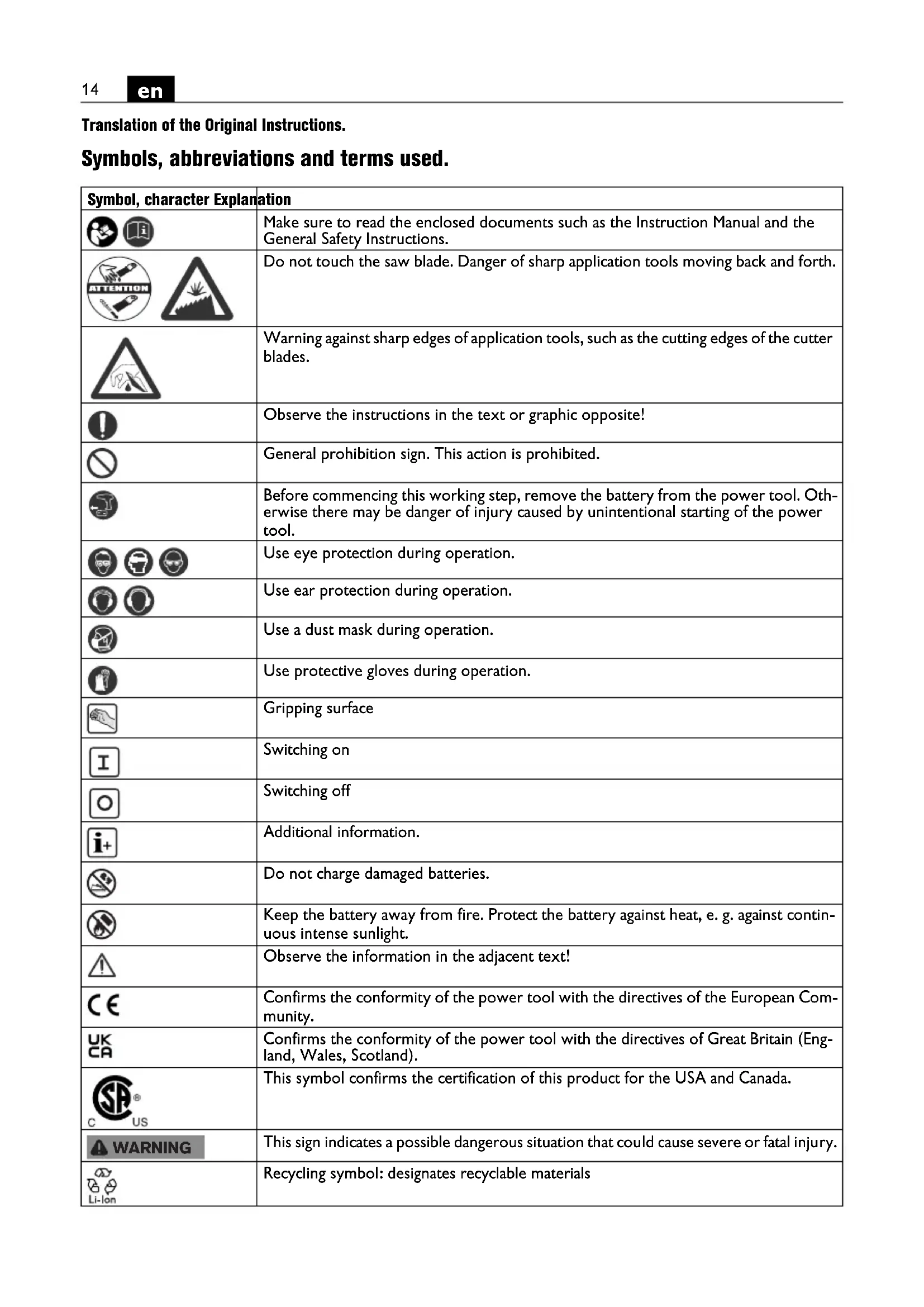Translation of the Original Instructions. Symbols, abbreviations and terms used. Symbol, character Explanation Make sure to read the enclosed documents such as the Instruction Manual and the General Safety Instructions. Do not touch the saw blade. Danger of sharp application tools moving back and forth. Warning against sharp edges of application tools, such as the cutting edges of the cutter blades. Observe the instructions in the text or graphic opposite! General prohibition sign. This action is prohibited. Before commencing this working step, remove the battery from the power tool. Oth- erwise there may be danger of injury caused by unintentional starting of the power tool. Use eye protection during operation. Use ear protection during operation. Use a dust mask during operation. Use protective gloves during operation. Gripping surface Switching on Switching off Additional information. Do not charge damaged batteries. Keep the battery away from fire. Protect the battery against heat, e. g. against contin- uous intense sunlight. Observe the information in the adjacent text! Confirms the conformity of the power tool with the directives of the European Com- munity. Confirms the conformity of the power tool with the directives of Great Britain (Eng- land, Wales, Scotland). This symbol confirms the certification of this product for the USA and Canada. This sign indicates a possible dangerous situation that could cause severe or fatal injury. Recycling symbol: designates recyclable materials WARNING15
