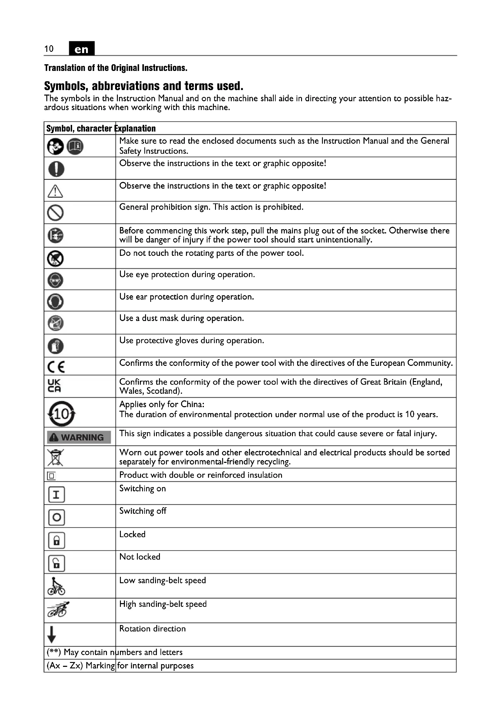 Translation of the Original Instructions. Symbols, abbreviations and terms used. The symbols in the Instruction Manual and on the machine shall aide in directing your attention to possible haz- ardous situations when working with this machine. Symbol, character Explanation Make sure to read the enclosed documents such as the Instruction Manual and the General Safety Instructions. Observe the instructions in the text or graphic opposite! Observe the instructions in the text or graphic opposite! General prohibition sign. This action is prohibited. Before commencing this work step, pull the mains plug out of the socket. Otherwise there will be danger of injury if the power tool should start unintentionally. Do not touch the rotating parts of the power tool. Use eye protection during operation. Use ear protection during operation. Use a dust mask during operation. Use protective gloves during operation. Confirms the conformity of the power tool with the directives of the European Community. Confirms the conformity of the power tool with the directives of Great Britain (England, Wales, Scotland). Applies only for China: The duration of environmental protection under normal use of the product is 10 years. This sign indicates a possible dangerous situation that could cause severe or fatal injury. Worn out power tools and other electrotechnical and electrical products should be sorted separately for environmental-friendly recycling. Product with double or reinforced insulation Switching on Switching off Locked Not locked Low sanding-belt speed High sanding-belt speed Rotation direction (**) May contain numbers and letters (Ax – Zx) Marking for internal purposes WARNING11