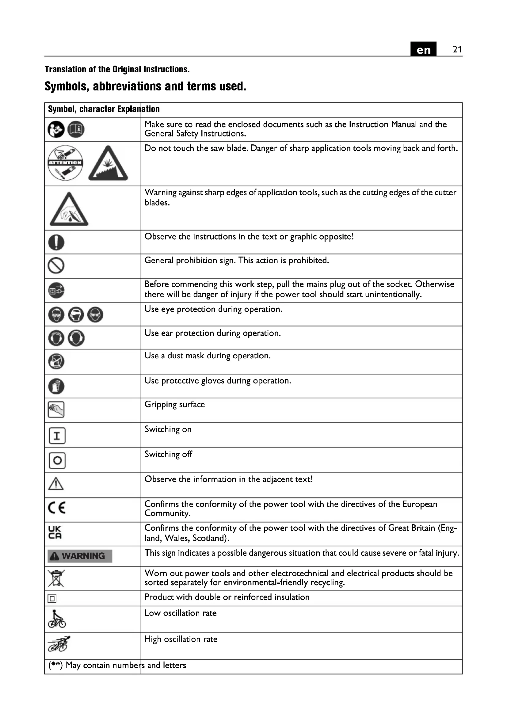 Translation of the Original Instructions. Symbols, abbreviations and terms used. Symbol, character Explanation Make sure to read the enclosed documents such as the Instruction Manual and the General Safety Instructions. Do not touch the saw blade. Danger of sharp application tools moving back and forth. Warning against sharp edges of application tools, such as the cutting edges of the cutter blades. Observe the instructions in the text or graphic opposite! General prohibition sign. This action is prohibited. Before commencing this work step, pull the mains plug out of the socket. Otherwise there will be danger of injury if the power tool should start unintentionally. Use eye protection during operation. Use ear protection during operation. Use a dust mask during operation. Use protective gloves during operation. Gripping surface Switching on Switching off Observe the information in the adjacent text! Confirms the conformity of the power tool with the directives of the European Community. Confirms the conformity of the power tool with the directives of Great Britain (Eng- land, Wales, Scotland). This sign indicates a possible dangerous situation that could cause severe or fatal injury. Worn out power tools and other electrotechnical and electrical products should be sorted separately for environmental-friendly recycling. Product with double or reinforced insulation Low oscillation rate High oscillation rate (**) May contain numbers and letters WARNING22