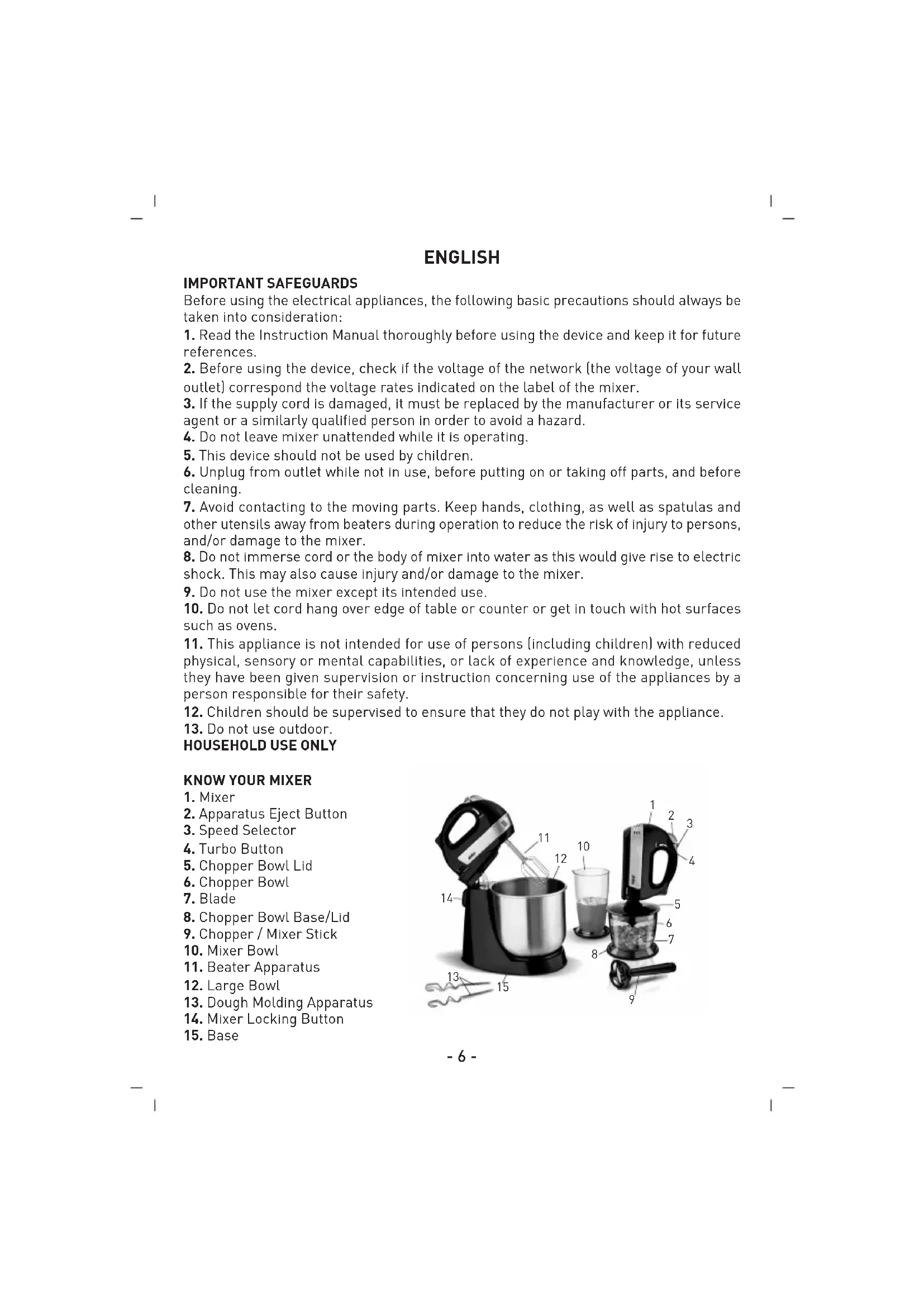 8. Do not immerse cord or the body of mixer into water as this would give rise to electric