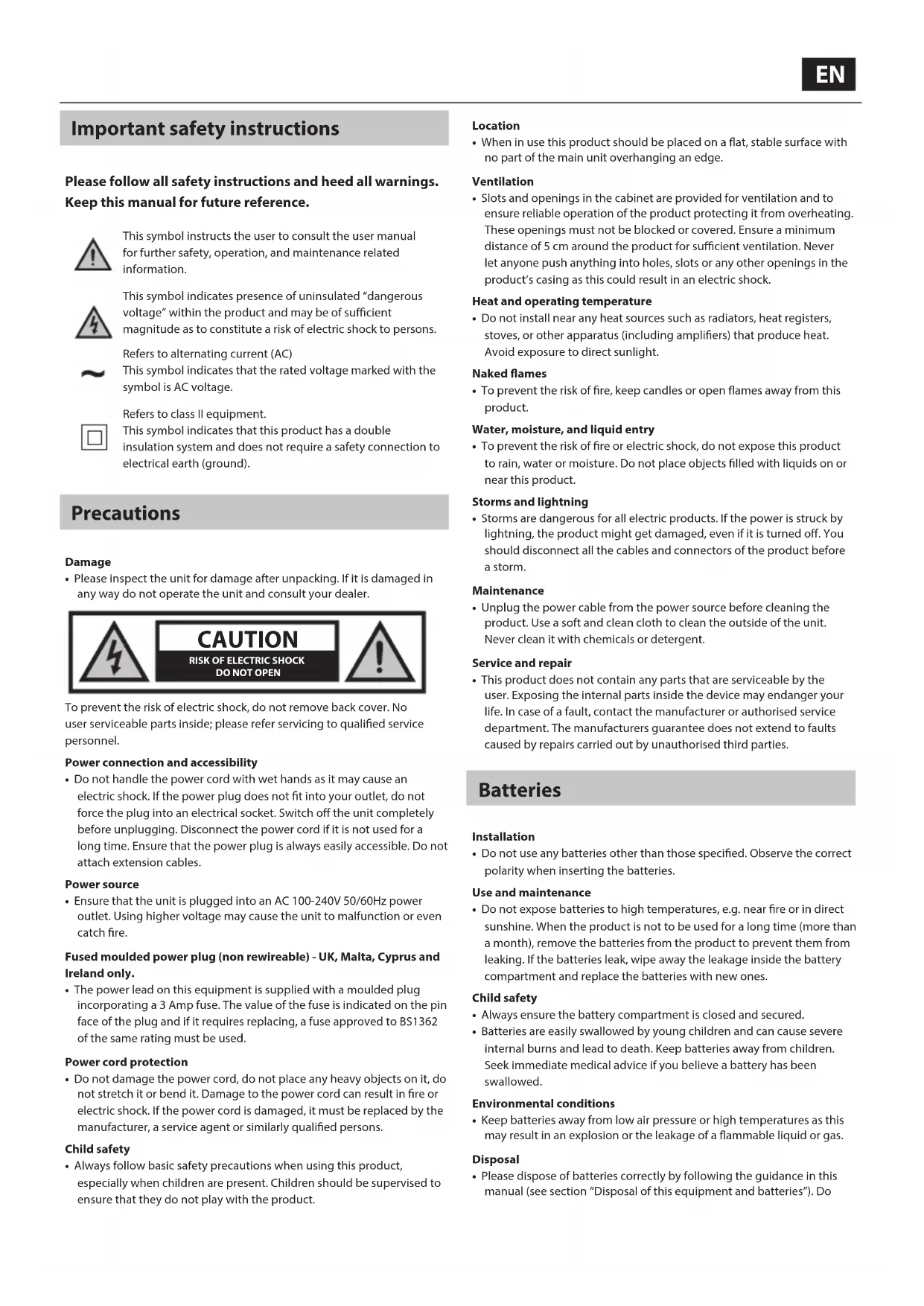 - Please dispose of batteries correctly by following the guidance in this manual (see section "Disposal of this equipment and batteries"). Do