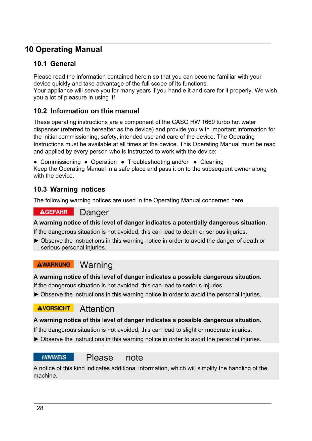 These operating instructions are a component of the CASO HW 1660 turbo hot water dispenser (referred to hereafter as the device) and provide you with important information for the initial commissioning, safety, intended use and care of the device. The Operating Instructions must be available at all times at the device. This Operating Manual must be read and applied by every person who is instructed to work with the device: ● Commissioning ● Operation ● Troubleshooting and/or ● Cleaning Keep the Operating Manual in a safe place and pass it on to the subsequent owner along with the device.