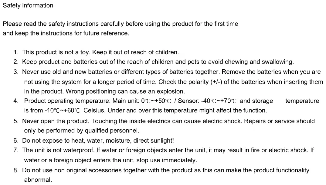 - Product operating temperature: Main unit: 0^ +50^ / Sensor: -40^ +70^ and storage temperature is from -10^ +60^ Celsius. Under and over this temperature might affect the function.