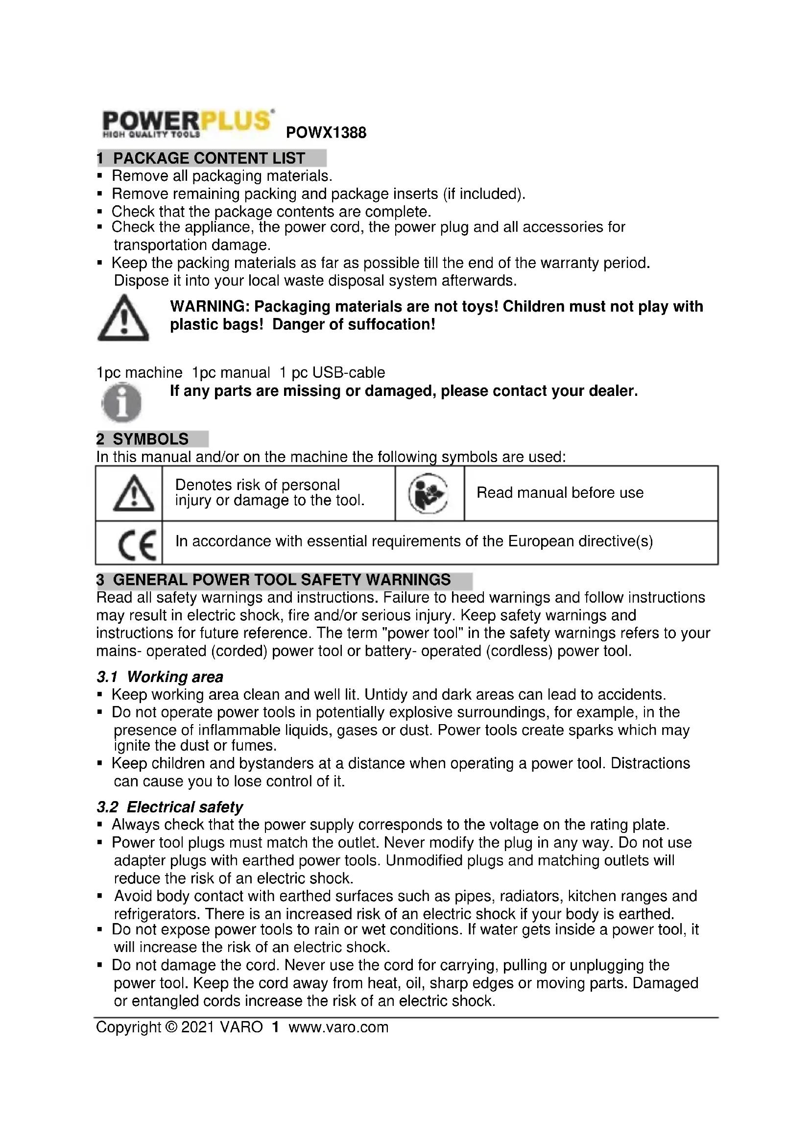- Use the power tool, accessories and cutting tools, etc., in accordance with these instructions and in the manner intended for the particular type of power tool, taking into account the working conditions and the work which needs to be done. Using a power tool in ways for which it was not intended can lead to potentially hazardous situations.POWX1388 Copyright © 2021 VARO 3 www.varo.com